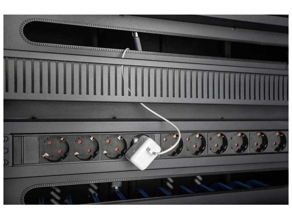 Mobilní nabíjecí skříňka od digitus® je ideálním a kompaktním řešením pro ukládání a nabíjení přenosných zařízení, jako jsou notebooky a tablety.B. Mobilní nabíjecí skříňky se často používají ve veřejných zařízeních.B školy k bezpečnému uložení zařízení na centrálním místě a k jejich nabíjení současně. Skříň obsahuje 3 řady po 10 nabíjecích stanicích, z nichž každá má na přední straně vlastní USB port. Kromě toho mohou být zařízení připojena k vestavěným zásuvkovým lištám (3 x 10násobný ochranný kontakt) na zadní straně. Díky velkorysým napájecím kabelovým posuvům a extra dlouhým regálům je zaručena optimální správa kabelů. Vestavěné ventilátory (3 x 24 V) ve spojení s větracími otvory zajišťují aktivní tepelnou diszi skříně.