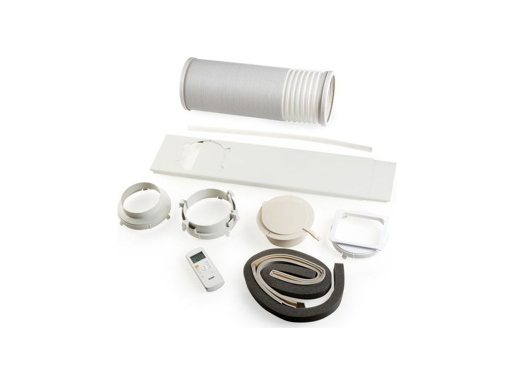 - Sada pro uchycení hadice pro odvod teplého vzduchu do okna (pro vertikálně, nebo horizontálně posuvná okna): okenní výsuvná lišta o délce 85-122 cm (šířka 16,5 cm), příruba na hadici pro snadné uchycení do lišty, pěnové těsnění