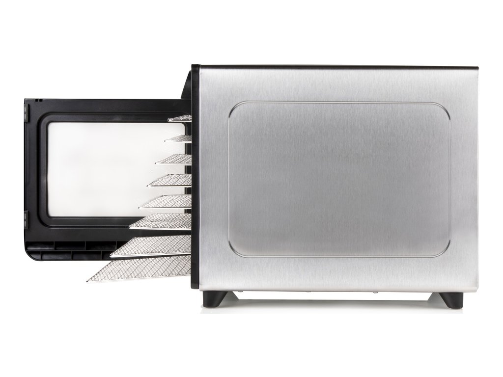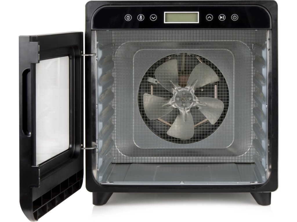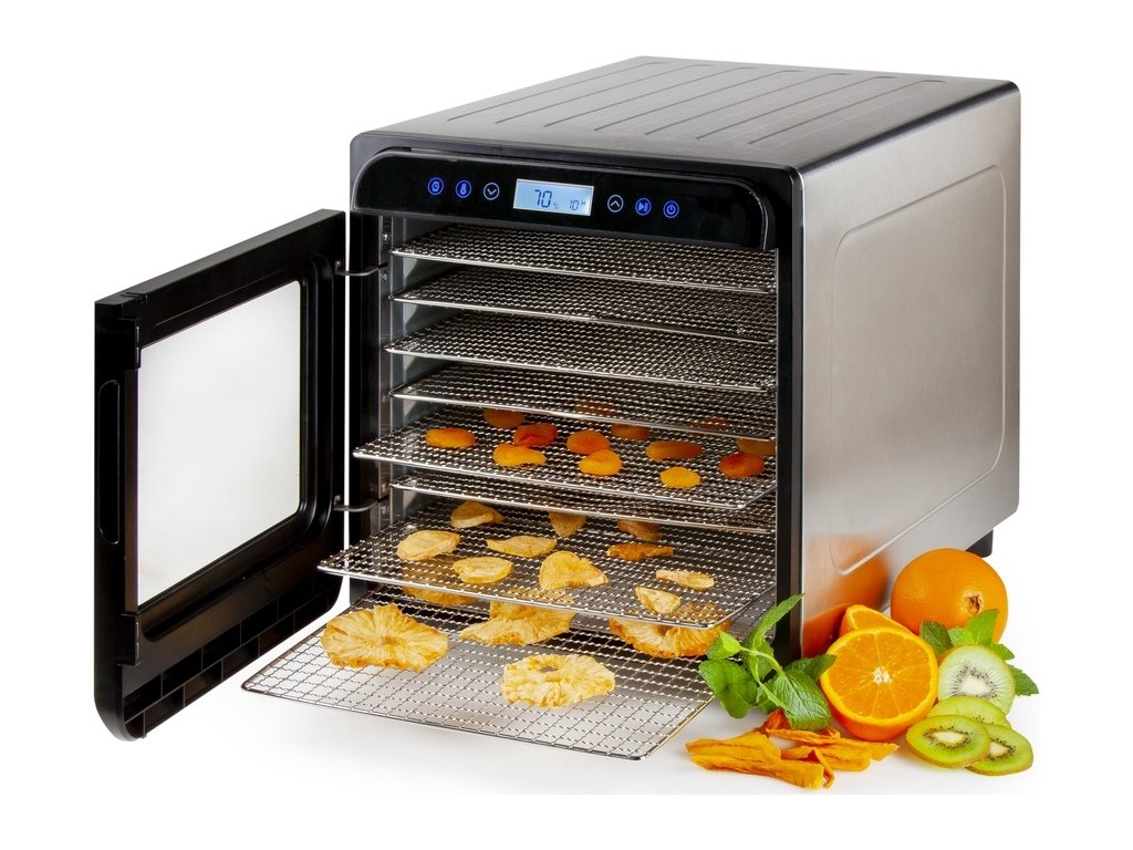 Výkonná a robustní sušička ovoce s tělem z vysoce kvalitního broušeného nerezu vybavená ventilátorem o velkém průměru, přesným digitálním ovládáním teploty a digitálním časovačem. Horizontální rozvod vzduchu zajišťuje rovnoměrné a efektivní sušení v celém objemu sušičky a snižuje hlučnost sušičky na minimum. Zvýšený příkon a rozsah nastavení teploty sušení umožňuje v sušičce efektivně sušit bylinky, ovoce s vysokým podílem vody, maso, nebo na speciálním platu bez otvorů i ovocné placky.Základní parametry sušičky ovoce: