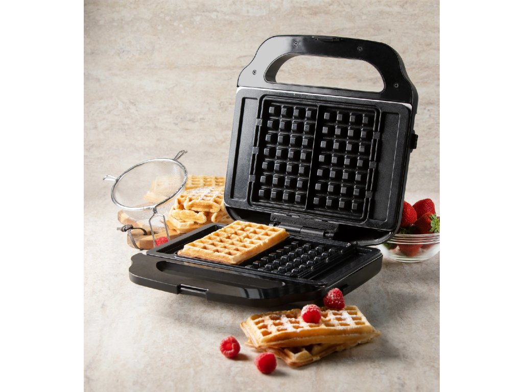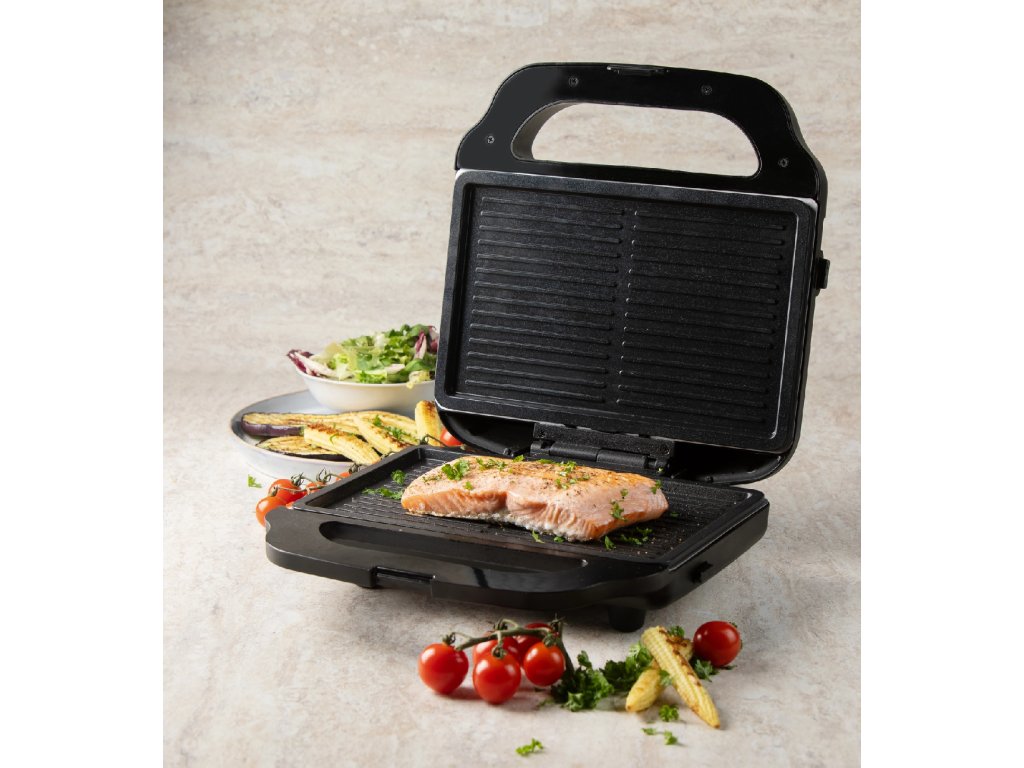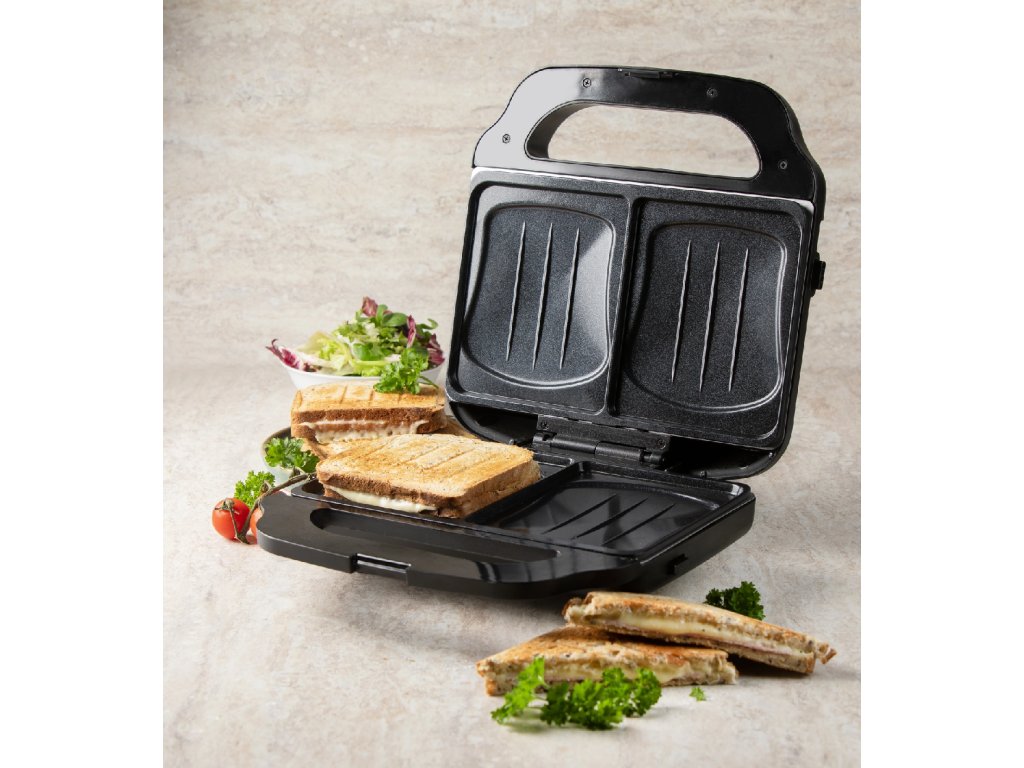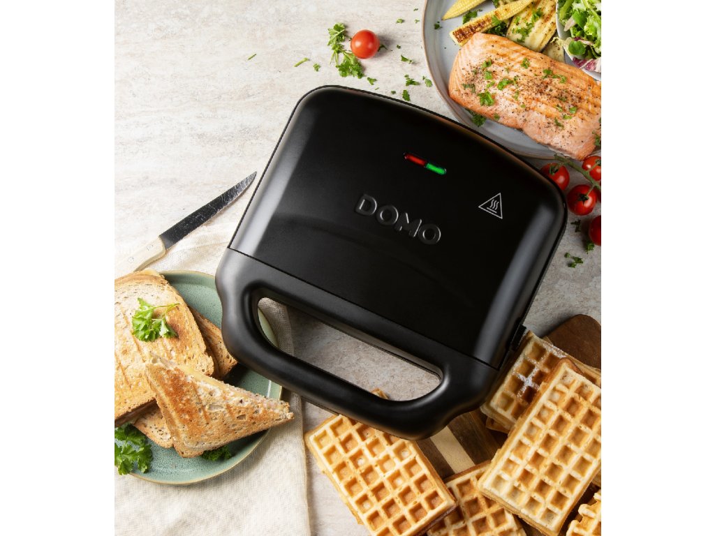 DOMO DO9291C Big Snack XL 3v1 v matně černém provedení je univerzální a vysoce výkonný přístroj pro každodenní použití.Obsahuje tři vyměnitelné sady desek pro XL toastové sendviče (o 50 % větší než standardní velikost), vafle belgického typu (4x7) a grilovaná jídla.