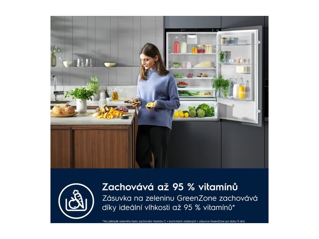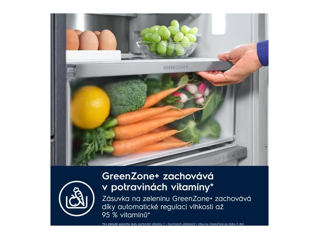 Centrum zdravého stravováníChladnička s mrazničkou 700 GreenZone má utěsněnou zásuvku, kde je vlhkost udržována na vyvážené úrovni, řízením míry kondenzace, což pomáhá předcházet zkažení potravin. Správnou úrovní vlhkosti se tak zachovává až 95 % vitamínů.*