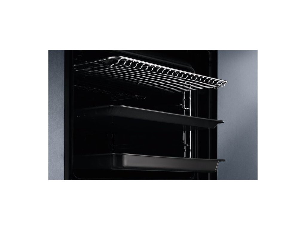 Výbava trouby - plechy: 1 smaltovaný koláčový plech na pečení, 1 odkapávací pekáč šedý smalt