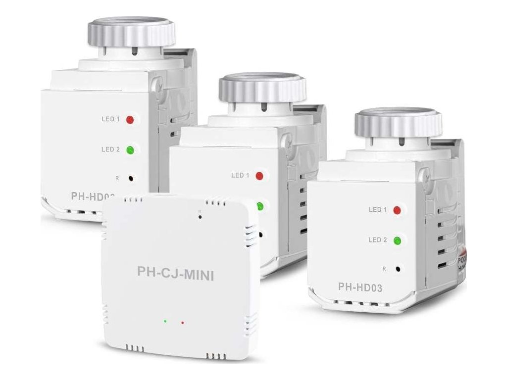 Set PH-Starter Pack 1 se třemi termostatickými hlavicemi slouží k regulaci teplovodního vytápění. Umožňuje nastavit teplotu v celém domě nebo v jednotlivých místnostech, zjištění aktuálních teplot i automatickou regulaci podle předem nastavených programů.Centrální jednotka umožňuje ovládat až 12 prvků (hlavic, spínacích zásuvek a dalších prvků)