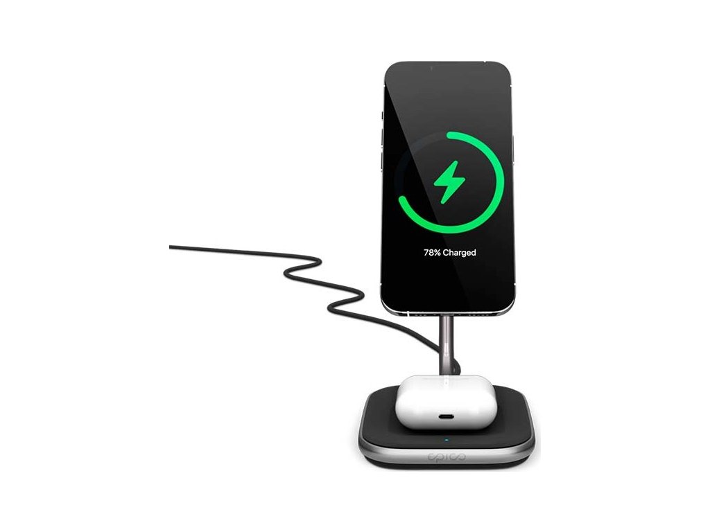 Epico 2in1 MagSafe Wireless Charger je magnetická nabíječka a stojan v jednom s MFi a exkluzivní Made for MagSafe certifikací, která zajišťuje 100% kompatibilitu s veškerými iOS aktualizacemi a zároveň nabíjí váš iPhone výkonem až 15 W. Nabíječka v sobě kombinuje výkonné funkce a prémiový a elegantní design. Současně s vaším iPhonem můžete nabíjet i AirPods s výkonem až 5 W. Díky silnému magnetu je smartphone bezpečně připevněn k nabíječce, takže můžete smartphone natočit do libovolného úhlu. Součástí balení je 20W PD nabíječka s kabelem USB-C na USB-C o délce 1 m.SPECIFIKACE: