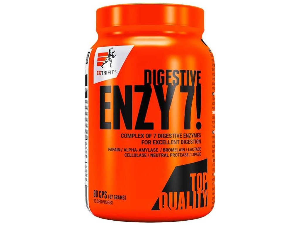 Enzy 7! Digestive Enzymes je naplněn v kapslích, které se rychle a dobře tráví, což je pro jejich účinek velmi důležité. Enzymy jsou v originálních kapslích s logem Extrifit®. Logo je natištěno přírodním barvivem.