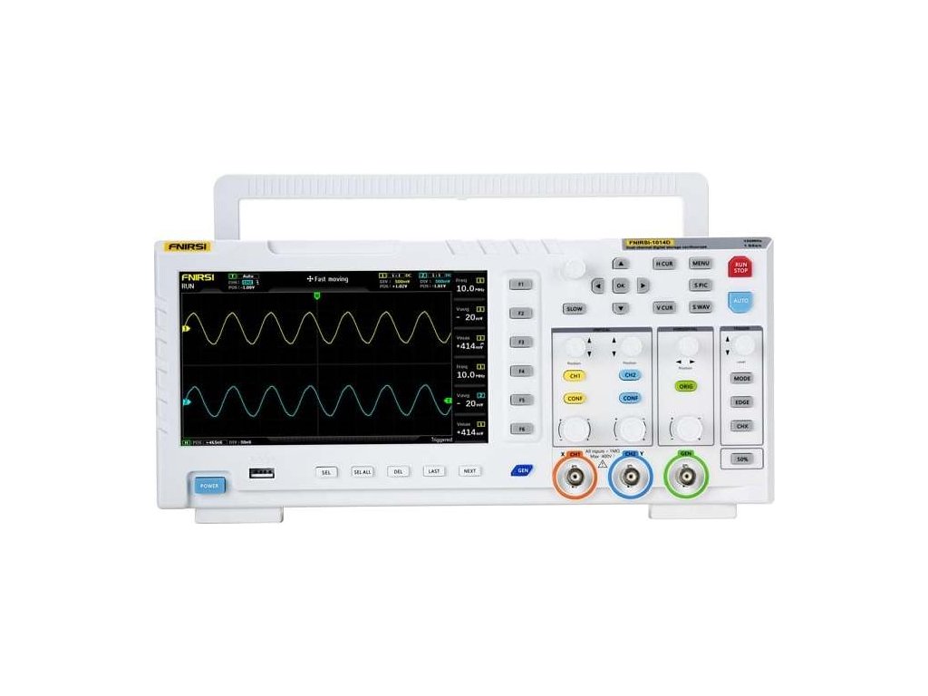 Generátor signálu osciloskopu 2 v 1 FNIRSI 1014DFNIRSI 1014D je kompaktní digitální osciloskop určený pro elektronické servisy, výzkumná a vývojová oddělení, technické vzdělávání a hobby. Umožňuje současnou analýzu a generování signálu, což výrazně rozšiřuje možnosti použití při diagnostice obvodů, testování prototypů nebo výuce práce s průběhy. Zařízení má dva vstupní kanály s impedancí 1 M? a podporuje šířku pásma 100 MHz při vzorkování 1GSa/s. Obsluhu usnadňuje 7palcový displej LCD s rozlišením 800 × 480 px. Je možná automatická analýza, FFT, režim X-Y a záznam kurzoru. K dispozici je také 1GB interní paměť s možností uložení až 1 000 průběhů a 1 000 snímků obrazovky a data lze snadno exportovat do počítače prostřednictvím USB.