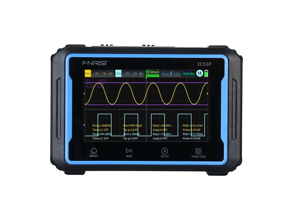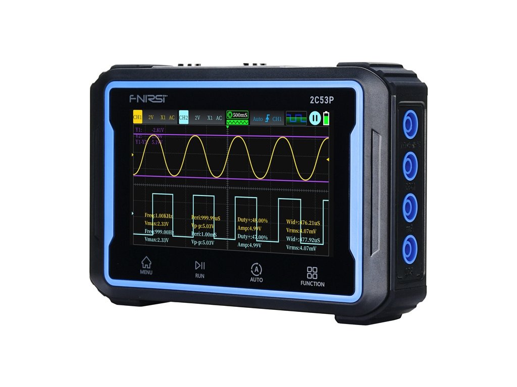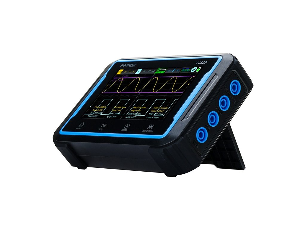 FNIRSI 2C53P je přenosný osciloskop, který kombinuje tři funkce: dvoukanálový osciloskop, digitální multimetr a DDS generátor. Přístroj nabízí rozsáhlé funkce v kompaktním provedení. Je vybaven 4,3palcovým dotykovým displejem IPS s rozlišením 480 × 272 pixelů, který umožňuje intuitivní ovládání a volné prohlížení průběhů s možností zvětšení a posunu. Osciloskop nabízí šířku pásma 50 MHz, vzorkovací frekvenci 250 MSa/s a 12 přepínatelných průběhů. Díky tomu je ideální pro měření napětí, proudu, odporu, kapacity nebo teploty s přesností až 19999 údajů.