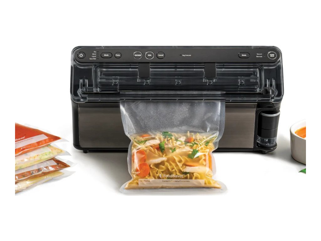 FoodSaver Elite All-in-One Liquid+ (VS5910X) je ideálním pomocníkem pro každou domácnost, která chce prodloužit trvanlivost potravin a zároveň minimalizovat plýtvání. S touto vakuovou svářečkou tak budete mít jistotu, že vaše potraviny zůstanou dlouhodobě čerstvé a chutné. Zařízení vám dokáže zajistit až pětkrát delší čerstvost potravin (oproti běžnému skladování). Díky svému sofistikovanému systému All-in-One si přitom hravě poradí s pevnými i tekutými potravinami – tato všestrannost je ideální pro udržení masa, zeleniny, nebo dokonce polévek a omáček v optimální kvalitě, což šetří jak vaše potraviny, tak peníze.Při práci s tekutými potravinami svářečka využívá funkci automatické detekce postupu tekutiny – díky tomu nehrozí nasátí obsahu do těla přístroje.