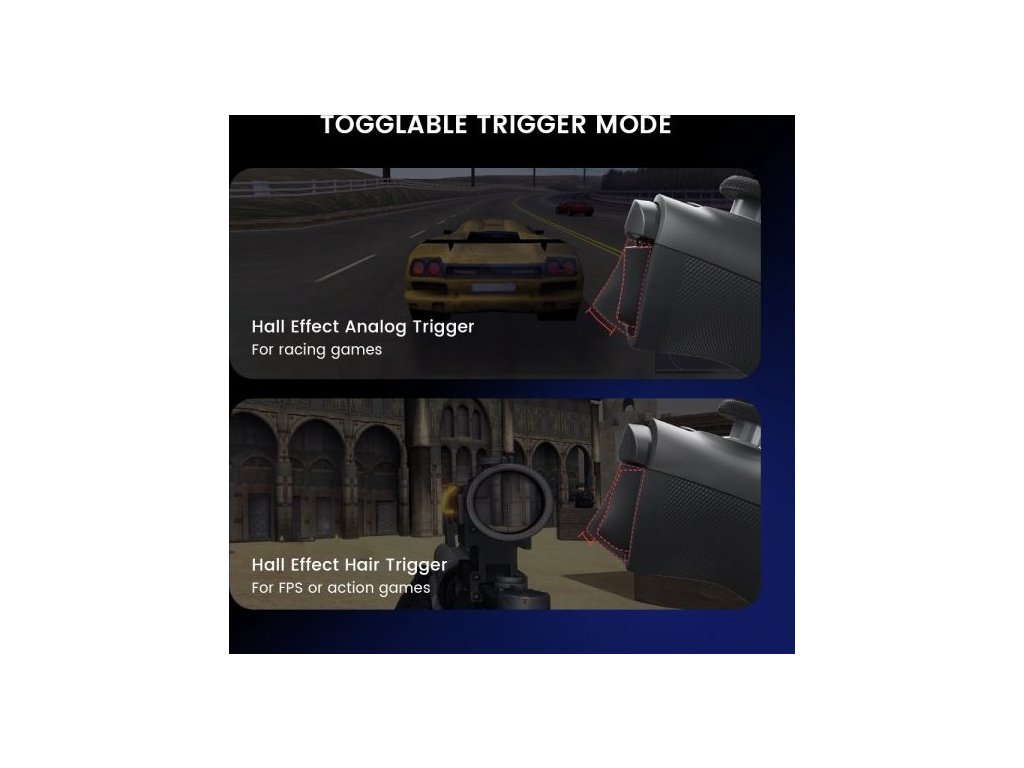 •Precizně vyladěné analogové spouště s technologií Hall efektu nabízejí bezkonkurenční plynulost a odezvu, což vám dává konkurenční výhodu v jakékoli hře. Pro FPS a akční hráče je k dispozici dokonce rychlé přepnutí do režimu Hair Trigger podržením tlačítek M+LT/RT. Ať už potřebujete přesné lineární ovládání nebo maximální odezvu, ovladač G8 vám poskytne konkurenční výhodu, kterou potřebujete.
