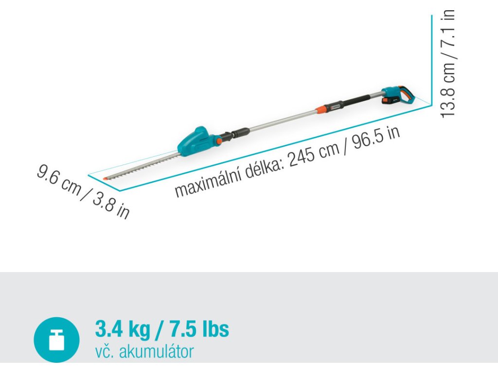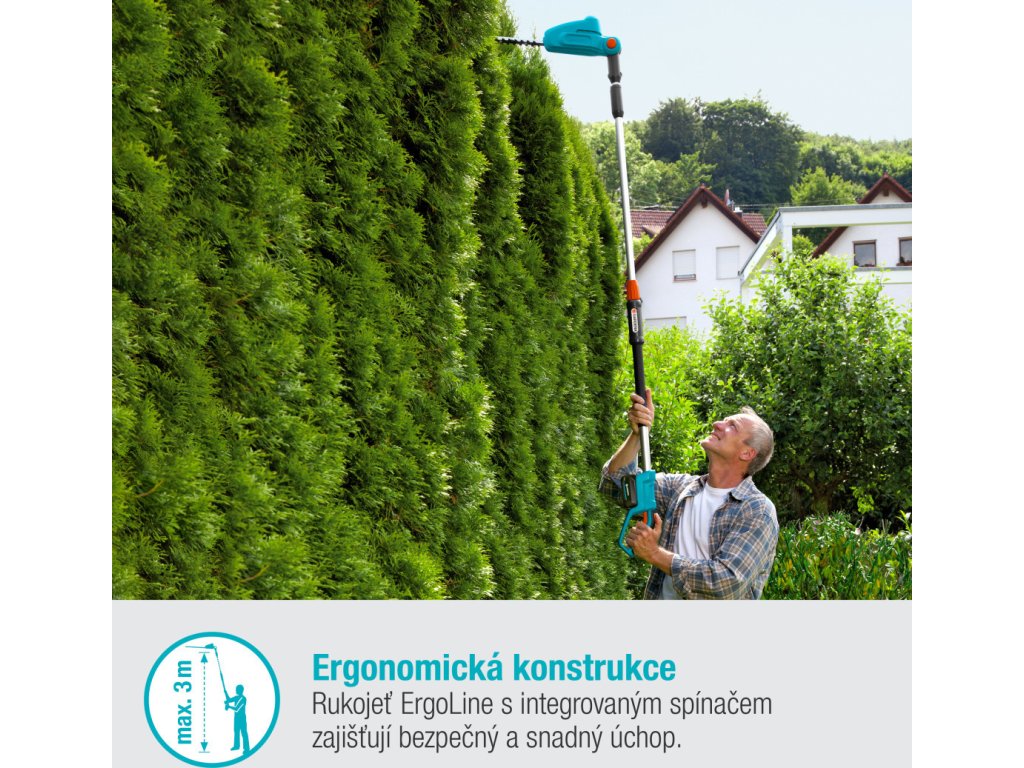 Teleskopické nůžky váží včetně akumulátoru 3,4 kilogramu; jejich rukojeť je ergonomicky navržena a má ideální těžiště. Znamená to, že vám pohodlně a bezpečně padnou do ruky, i v případě, že je teleskopická rukojeť plně vysunuta, takže využijete celý dosah tří metrů. Potřebujete zastřihnout vršek živého plotu? Ani to není problém: hlavu zastřihovače lze naklonit - tato funkce je také velmi pohodlná při řezání půdopokryvných rostlin. Už se nemusíte ohýbat a odlehčíte také namáhání svých kolen.