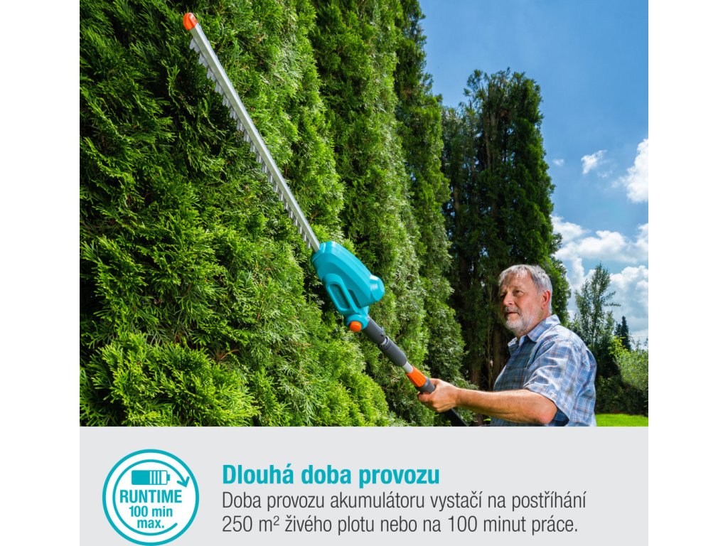 Akumulátorové nůžky na živý plot s teleskopickou násadou pro vysoké živé plotyVysoké živé ploty chrání soukromí. Problém ale vznikne při stříhání - brzy si budete přát, aby soukromí nebylo takovou prioritou, protože by vám to hodně usnadnilo práci. Pokud ovšem nepoužíváte akumulátorové teleskopické nůžky na živý plot GARDENA THS 42/18V P4A. Snadno zvládnou i živé ploty s výškou 3 m. Stříhání z vratkého žebříku je minulostí, celou dobu budete stát oběma nohami bezpečně na pevné zemi a nebudete se muset starat o napájecí kabely.