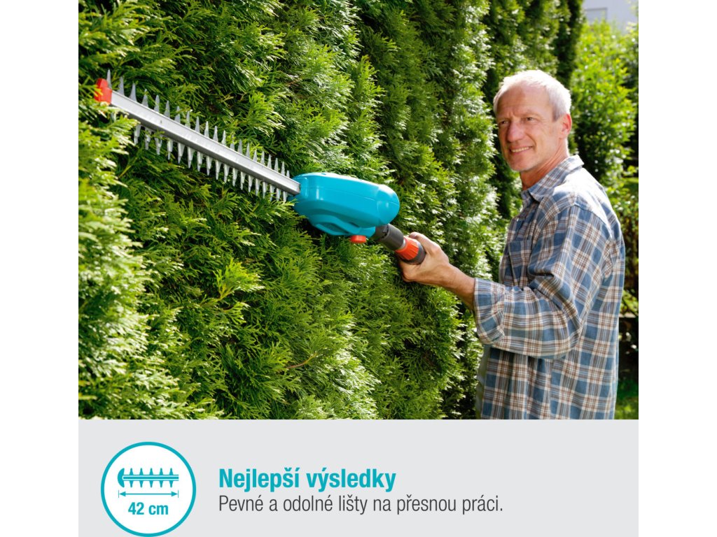 Bez větší námahy ostříhá větve a výhonky do tloušťky 16 milimetrů; optimalizovaná geometrie nožů zajišťuje efektivní a čistý střih. Díky délce nožů 42 centimetrů rychle ostříháte živý plot po celé jeho šířce.