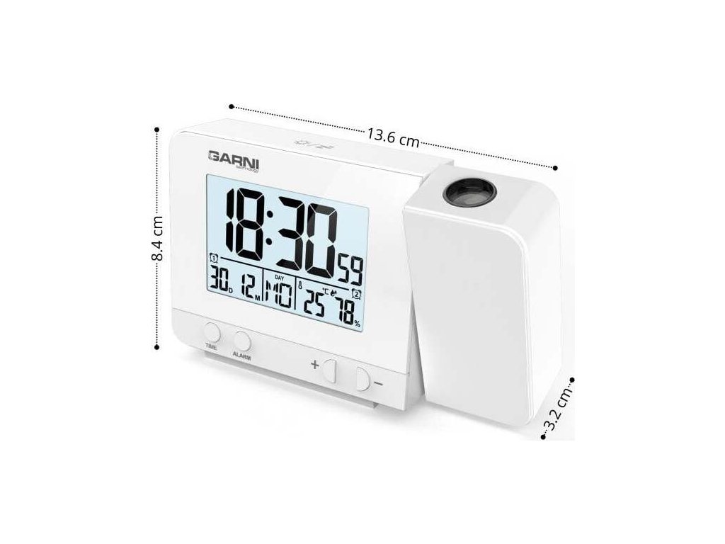 Projektor ano, projekce času a vnitřní teploty s možností otočení obrazu o 180°, možnost sklopení tubusu projektoru o 90° dopředu a dozadu, možnost vypnutí spolu s displejem