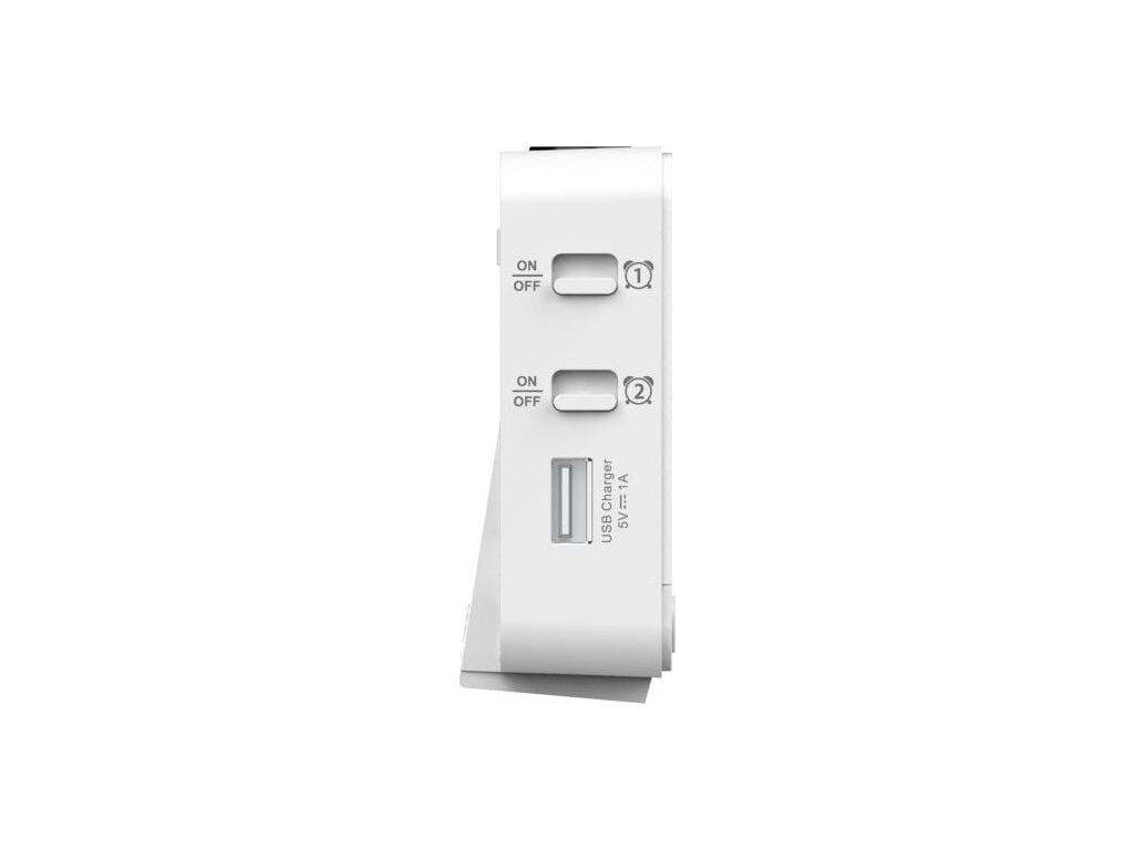 - budík s 2 budícími časy s funkcí opakovaného buzení (Snooze) po 5 minutách