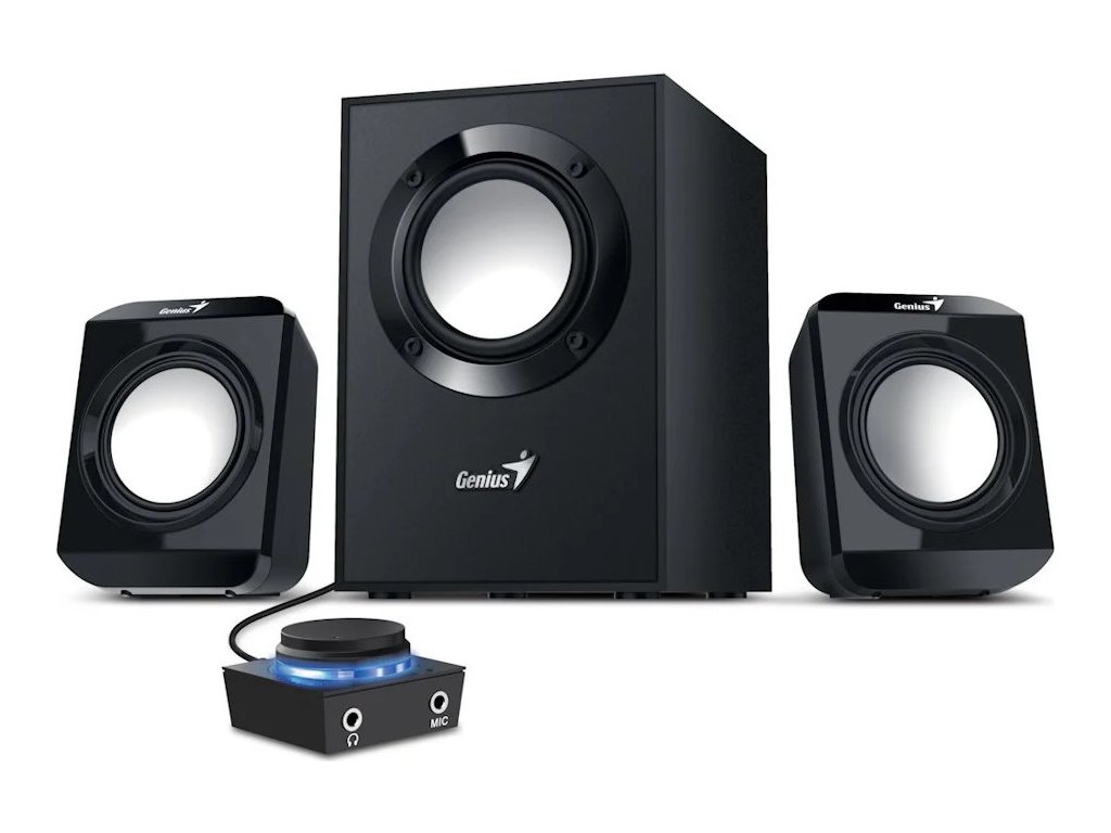 Genius SW-2.1 300 Ver. IIMultimediální reproduktorový systém v konfiguraci 2.1 s celkovým výkonem 10 W. 3" subwoofer nabízí dokonale hluboké basy a dva 2,5" satelity zajistí vysoké vokály. Potěší také ovládání hlasitosti, výstup pro sluchátka a vstup pro mikrofon na podsvíceném ovládacím modulu.
