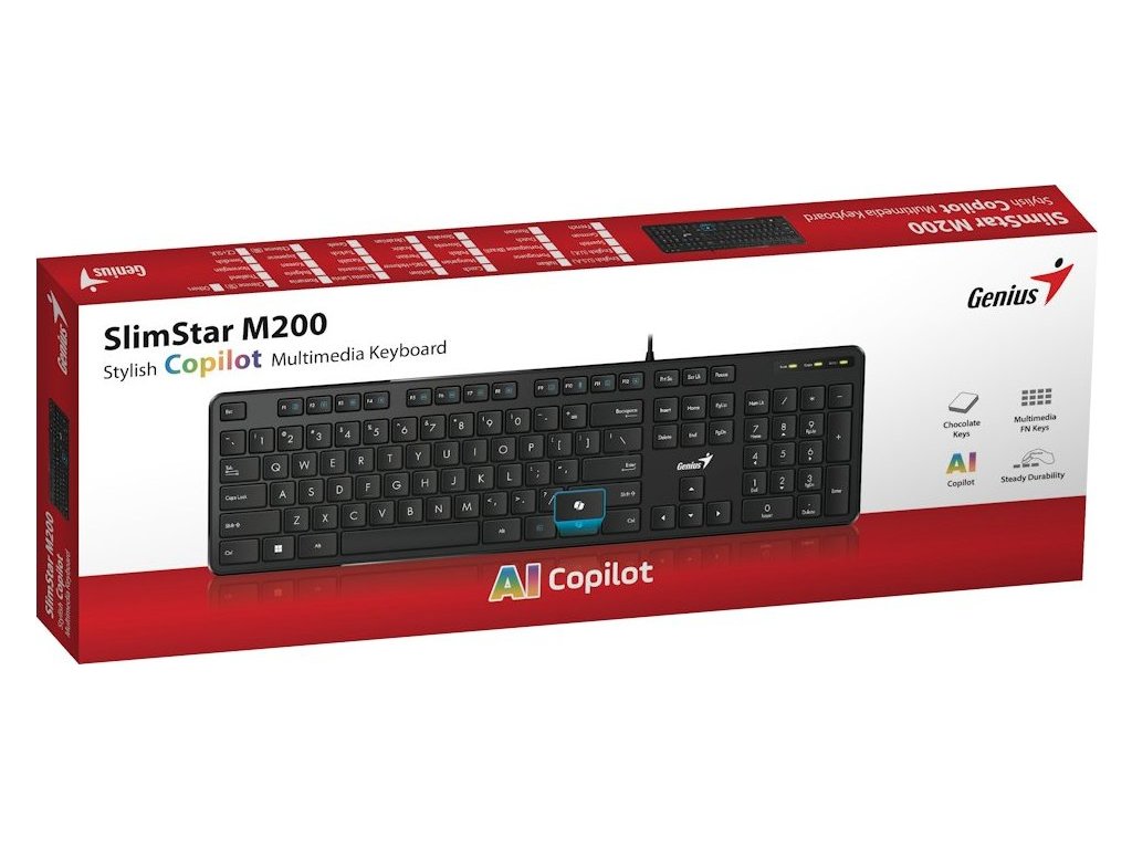 Genius Slimstar M200 Copilot – AI klávesnice pro každodenní úkolyKlávesnice Genius Slimstar M200 Copilot, na kterou se můžete spolehnout každý den ve firemní kanceláři. Jednoduchý design s nízkoprofilovými klávesami zajišťuje příjemný stisk a tichý chod. Součástí je numerická část, díky čemuž je zadávání číselných znaků rychlé a jednoduché. Klávesnice Genius Slimstar M200 Copilot přináší také jednoduché řešení pro podporu produktivity.