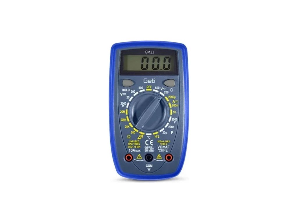 Multimetr GETI GM33B nalezne své uplatnění při měření široké škály elektrických veličin jako jsou například: napětí (DCV a ACV), proud (DCA), odpor, kapacita a mnoho dalších. Přehledný displej doplněný o podsvícení, zajišťuje snadnou a přesnou čitelnost naměřených hodnot i za horších světelných podmínek. Přístroj je také vybaven dalšími praktickými funkcemi, jako je indikace slabé baterie, ochrana proti přetížení, testování diod, měření kontinuity nebo testování tranzistorů, které dodávají multimetru uživatelsky přívětivý charakter, který díky kompaktním rozměrům a nízké hmotnosti zaručuje snadnou manipulaci i v těžko přístupných místech. Všechny tyto vlastnosti z tohoto přístroje činí všestranného pomocníka, nejen v dílnách, ale i domácnostech.Parametry produktu