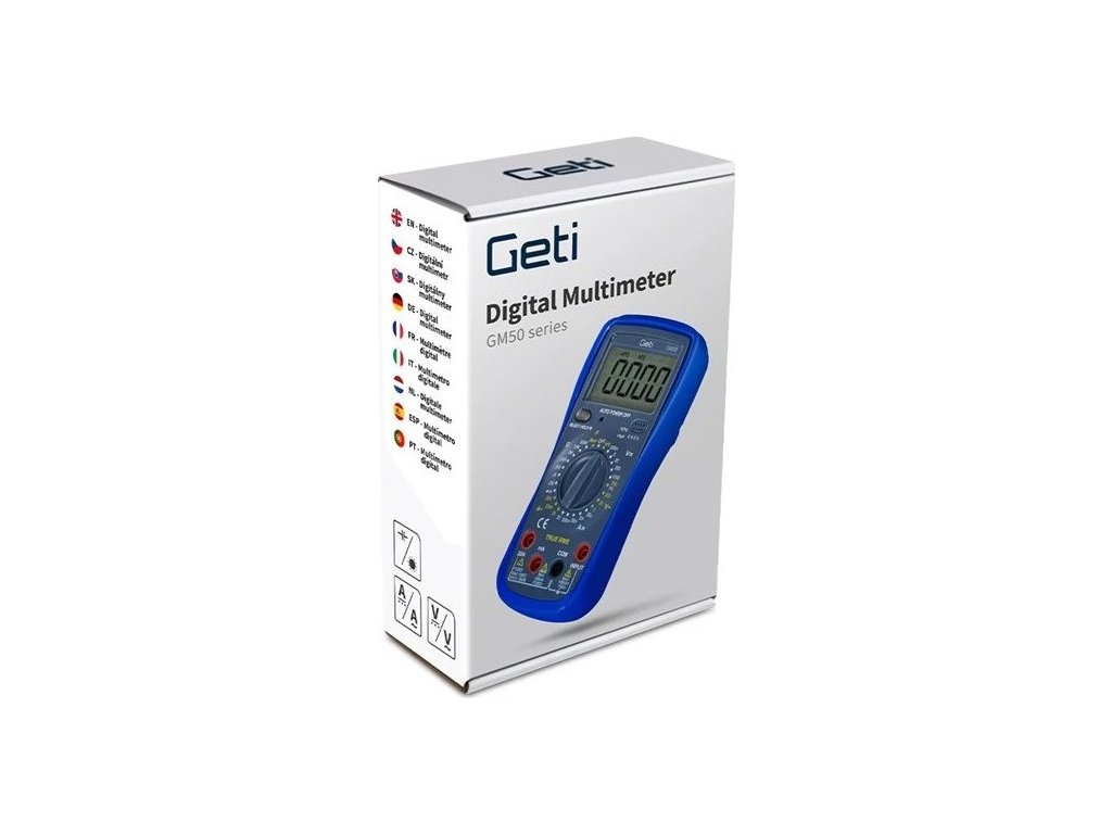 Multimetr GETI GM50D je profesionální přístroj vhodný k měření široké škály elektrických veličin jako jsou: napětí (DCV a ACV), proud (DCA a ACA), odpor, kapacita a další. Velký a podsvícený displej, zajišťuje snadné a dokonalé čtení zobrazených údajů i za zhoršených světelných podmínek. Přístroj je také vybaven dalšími praktickými funkcemi, jako je indikace slabé baterie, ochrana proti přetížení, testování diod nebo měření kontinuity, které dodávají multimetru uživatelsky přívětivý charakter. Díky svému tvaru a kompaktním rozměrům zaručuje tento přístroj snadnou a přesnou manipulaci. Všechny tyto vlastnosti z tohoto multimetru činí ideální přístroj nejen pro profesionály, ale také dílny a domácnosti.Parametry produktu
