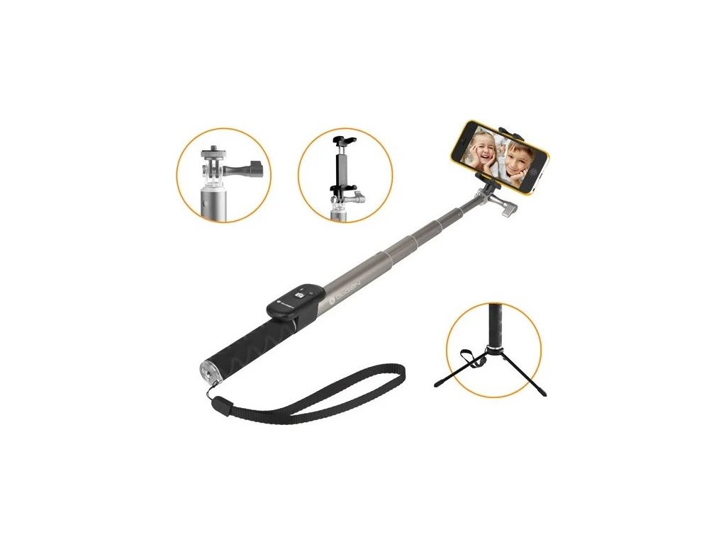 Díky bohatému příslušenství se stává selfie tyč univerzálním cestovním fotografickým příslušenstvím. Upevníte na ni samozřejmě telefon libovolné úhlopříčky, dále klasický fotoaparát se stativovým závitem nebo outdoorovou kameru. Tyč je vybavena držáky pro všechna tato zařízení. Navíc je balení doplněno o tripod - variabilní stojánek se stativovým závitem. Ten využijete především pro focení klasickým foťákem na nerovných terénech se samospouští, ale díky stativovému závitu na něj snadno našroubujete i celou selfie tyč s různými koncovkami.
