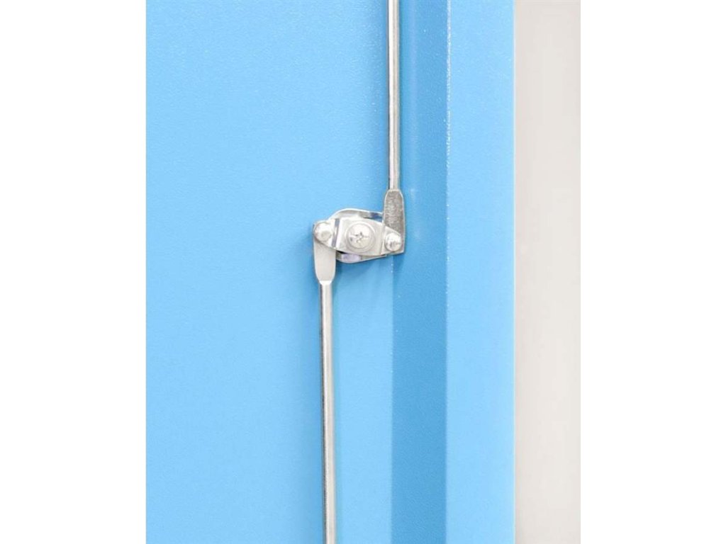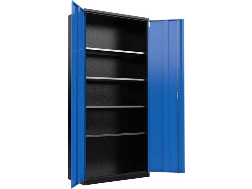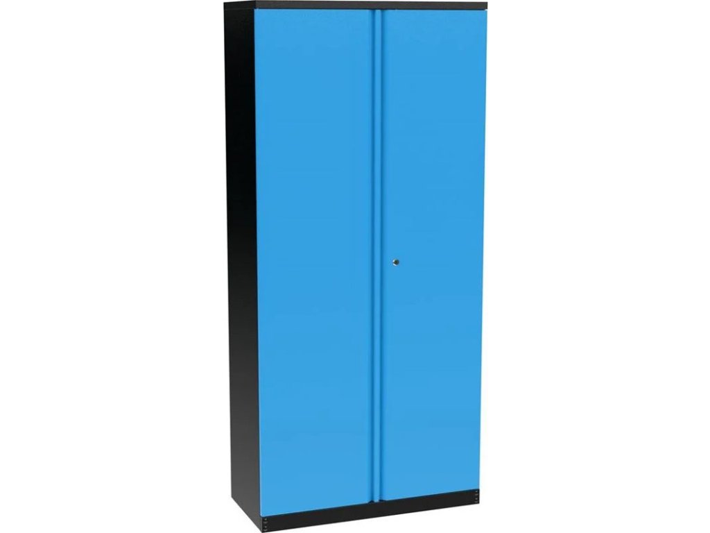 Skříň na nářadí, určená k využití v domácích nebo údržbářských dílnách, montážních provozech apod.Dvoudveřová celokovová skříň (-> uzamykatelná cylindrickým zámkem; 2 klíče). Vybavení: 4 ukládací police (-> rozměry d x š: 850 x 360 mm; max. nosnost: 30 kg; s volitelným nastavením výšky).Konstrukce: korpus z ocelového plechu, zapuštěná madla (2), barevné provedení: RAL 9005 (rám, police), RAL 5015 (dveře). Dodáváno v rozloženém stavu.Doplňkové parametry