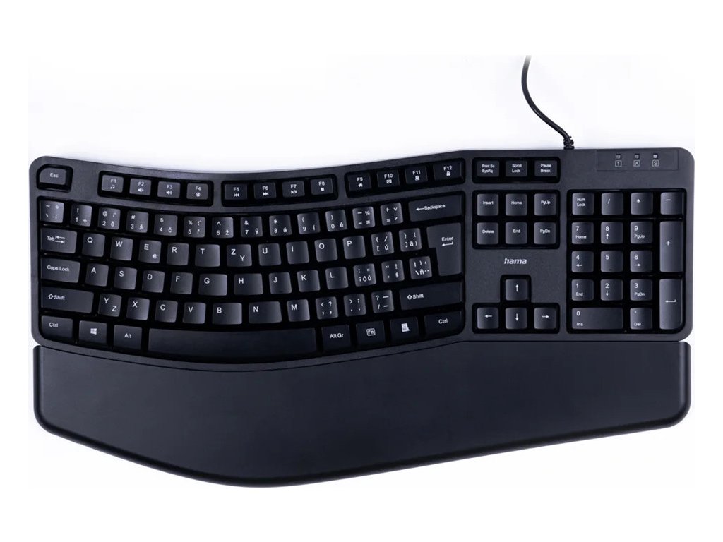 - ergonomicky tvarovaná klávesnice pro větší komfort a správné držení těla při práci, předchází bolestem a přetížení ramen a šíje- mírné zakřivení pole kláves umožňuje přirozenější polohou rukou při psaní