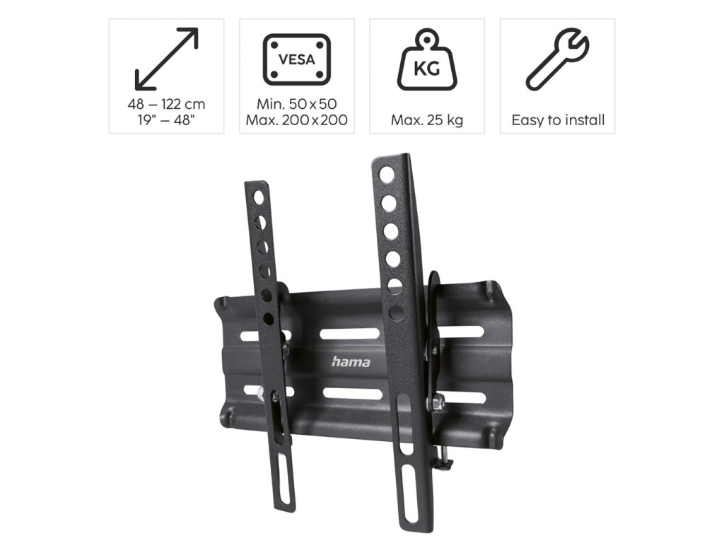 - naklápěcí držák pro TV obrazovky s úhlopříčkou cca 19 až 48 palců (48 až 122 cm)- VESA max. 200x200, nastavitelná ramena pro jakoukoliv menší rozteč závitů