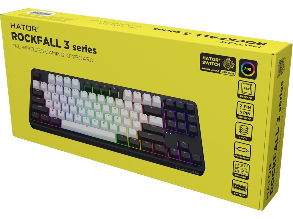 HATOR Rockfall 3 TKL Wireless – Bezdrátová mechanická klávesnice s QMK/VIAKompaktní mechanická klávesnice HATOR Rockfall 3 TKL Wireless (HTK850) bez numerické části je ideální volbou pro ty, kteří hledají vysoký výkon a pohodlí v menším provedení. S třemi možnostmi připojení, dlouhou výdrží baterie a promyšlenou vnitřní architekturou se stane spolehlivým společníkem pro práci i hraní.