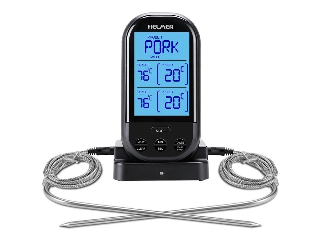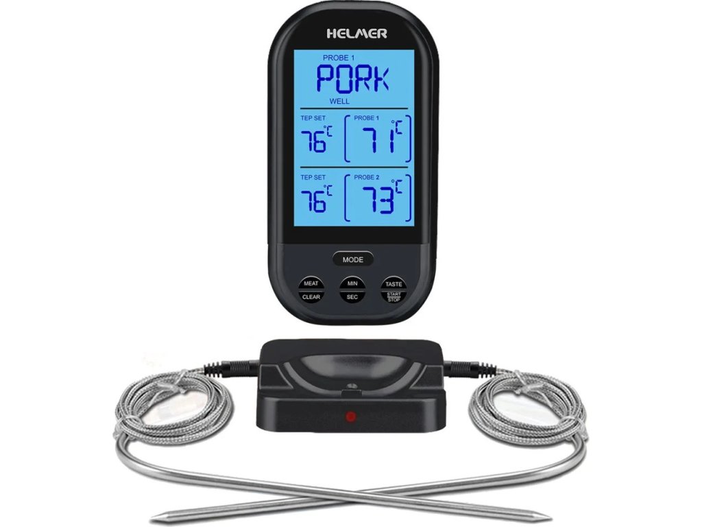 Helmer TM 24Bezdrátový kuchyňský teploměr disponující dvěma sondami umožní přesné měření teploty masa či zeleniny v rozmezí 0 °C až 250 °C. Stačí zapíchnout sondy do pokrmu, umístit jednotku s displejem mimo troubu, pánev nebo gril a na dálku kontrolovat průběh pečení. Komunikace mezi sondami a jednotkou, na které jsou přehledně zobrazovány potřebné informace, probíhá bezdrátově, a to až na vzdálenost 40 m. K dispozici je také funkce časovače, která vás upozorní alarmem na dosažení přednastavené teploty či času. Pro usnadnění je vybaven 8 přednastavenými teplotami dle vybraného druhu masa: hovězí, jehněčí, telecí, hamburger, vepřové, krůtí, kuřecí a ryby. Samozřejmostí pak je možnost nastavení vlastního programu a míry propečení (málo propečené, středně propečené, krvavé).