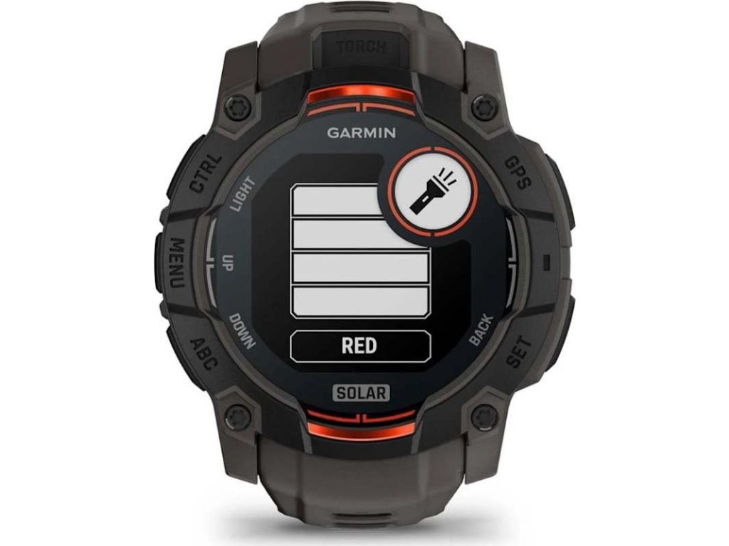 V pouzdře hodinek se ukrývá výkonná LED svítilna s nastavitelným jasem v několika úrovních a světlem bílé nebo červené barvy.