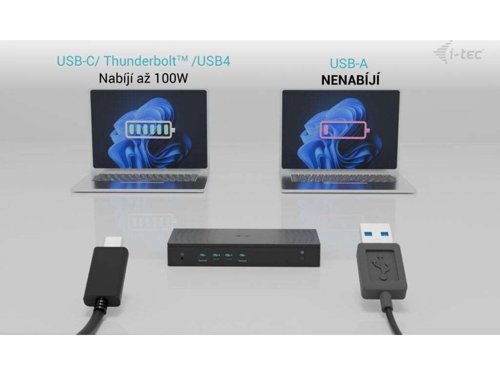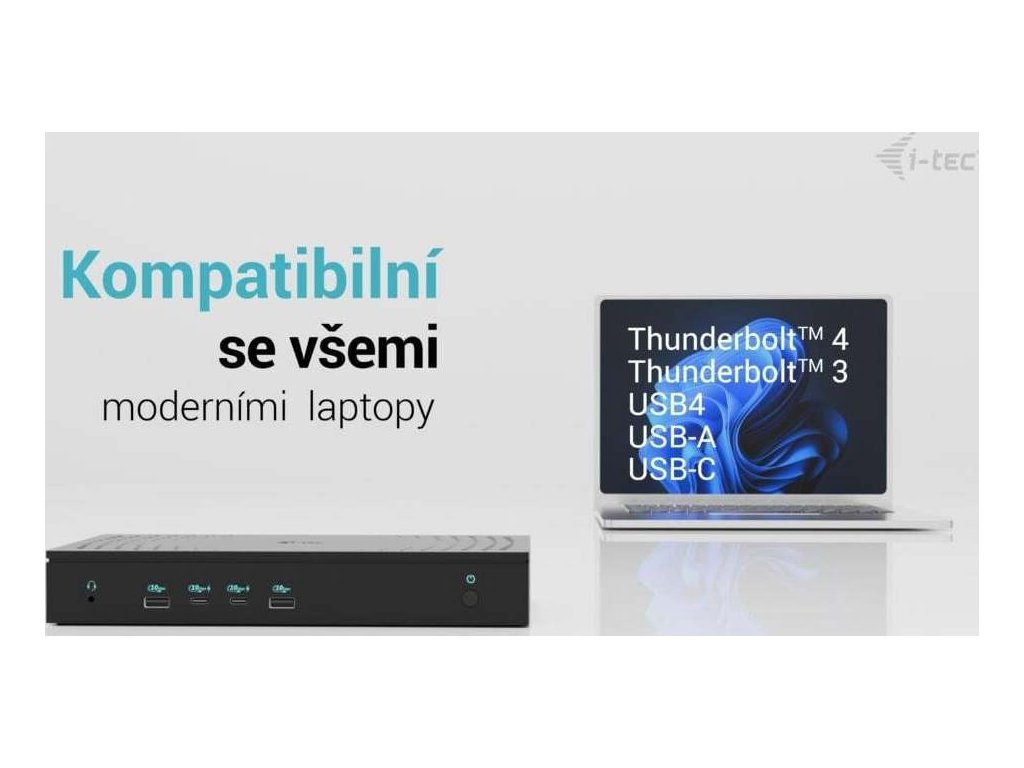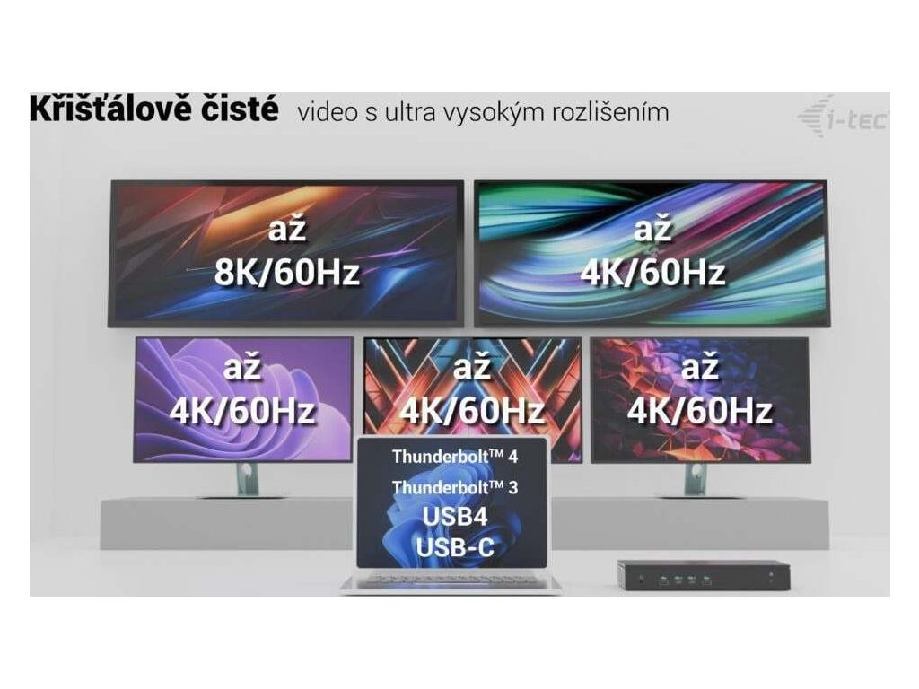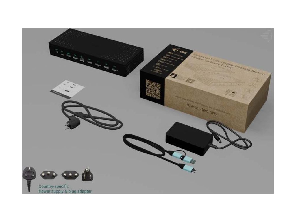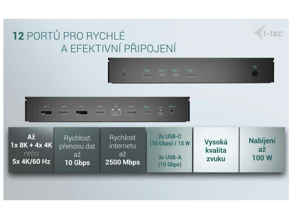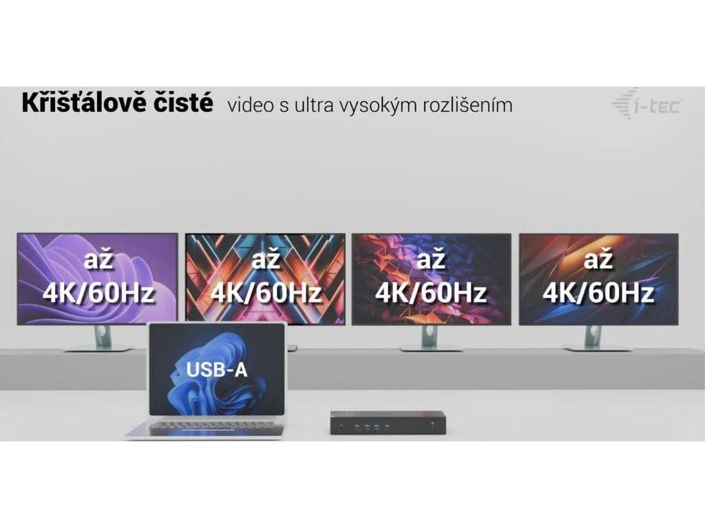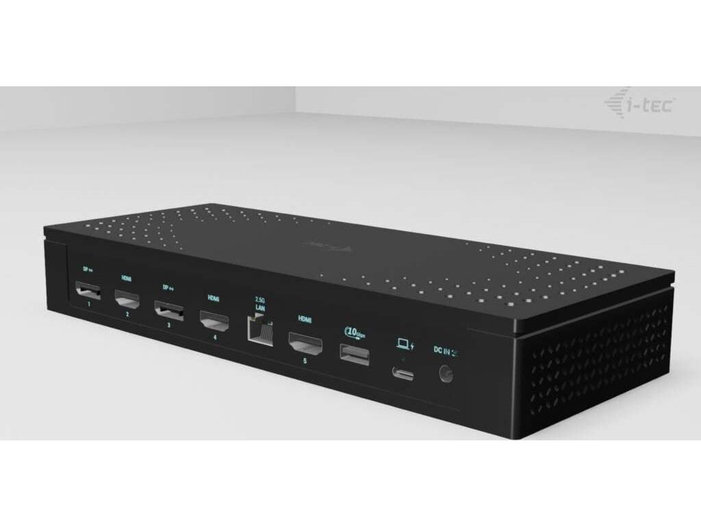 i-tec Universal 5x 4K/60Hz Display Docking Station + Power Delivery 100WDokovací stanice, postavená na nejnovější platformě DisplayLink DL7400, která umožňuje současné připojení až pěti monitorů.