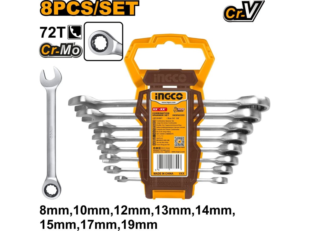 Ingco HKSPAR1082 Klíč očkoplochý račnový CrMo 8-19mm 8ks