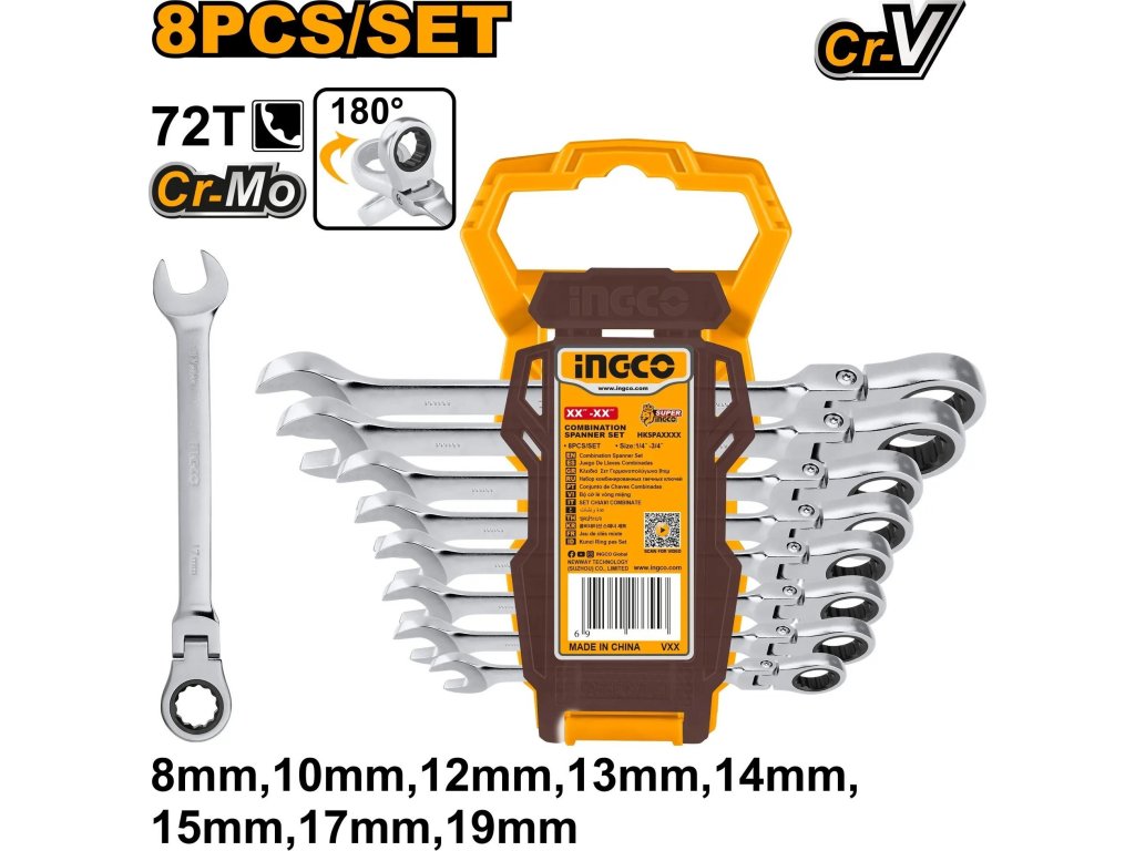 Ingco HKSPAR1083 Klíč očkoplochý račnový CrMo 8-19mm 8ks, CrV
