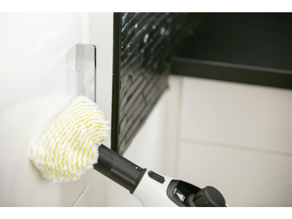 varných desek, digestoří nebo nejmenších prasklin a výklenků – výkonná pára a rozsáhlá řada příslušenství zajistí bezchybné výsledky. Díky sadě na čištění podlah EasyFix lze praktický ruční parní čistič využít na čištění podlah. Dokonce i odolné nečistoty