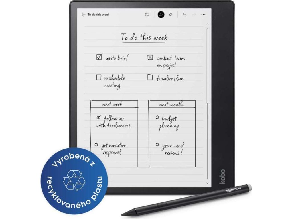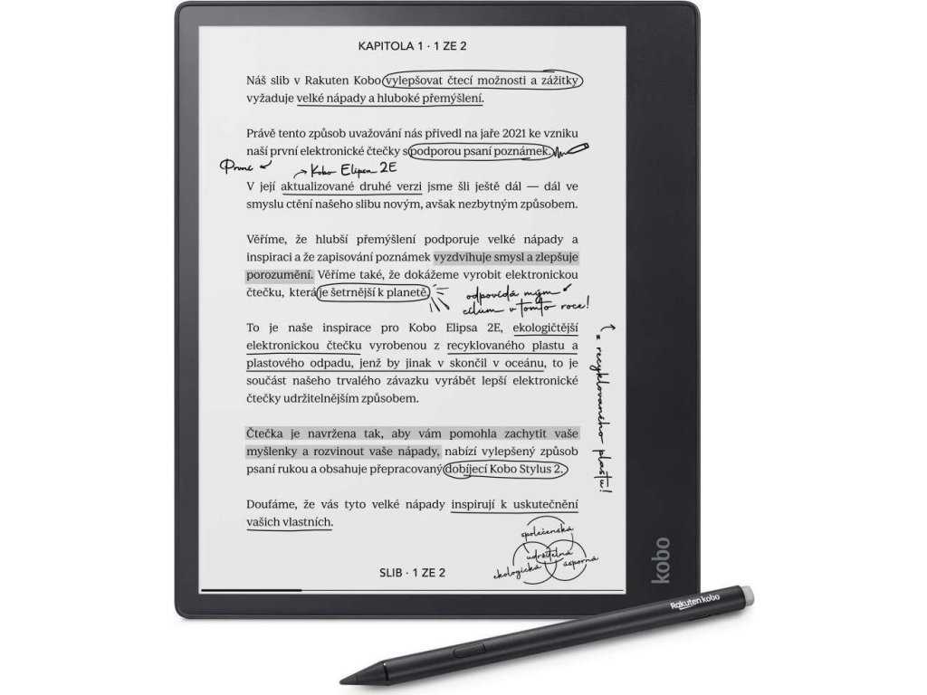 Vylepšená čtečka Kobo Elipsa 2E, dodávaná spolu s perem Kobo Stylus 2, je určena pro lidi, kteří přemýšlejí ve velkém. Je navržena tak, aby vám pomohla soustředit se a uspořádat si myšlenky.Zapisujte si poznámky přímo do elektronických knih a souborů PDF* díky vylepšené možnosti psaní poznámek v čtečce Kobo Elipsa 2E. Vytvářejte a přizpůsobujte si zápisníky, které toho zvládnou více než papír, a exportujte je pomocí integrovaných cloudových služeb. Čtěte a pište pohodlně na dotykovém displeji o velikosti 10,3" s technologií ComfortLight PRO, která omezuje modré světlo a zmírňuje únavu očí. Poslouchejte audioknihy Kobo* pomocí bezdrátové technologie Bluetooth®†. Díky 32GB úložišti si můžete vzít celou knihovnu a všechny poznámky s sebou, ať už se chystáte kamkoli. Kobo Elipsa 2E, vyrobená z recyklovaného plastu a plastu, který by jinak pravděpodobně skončil v oceánu, je šetrnější k životnímu prostředí a je navržena tak, aby zachytila všechny vaše velké myšlenky.