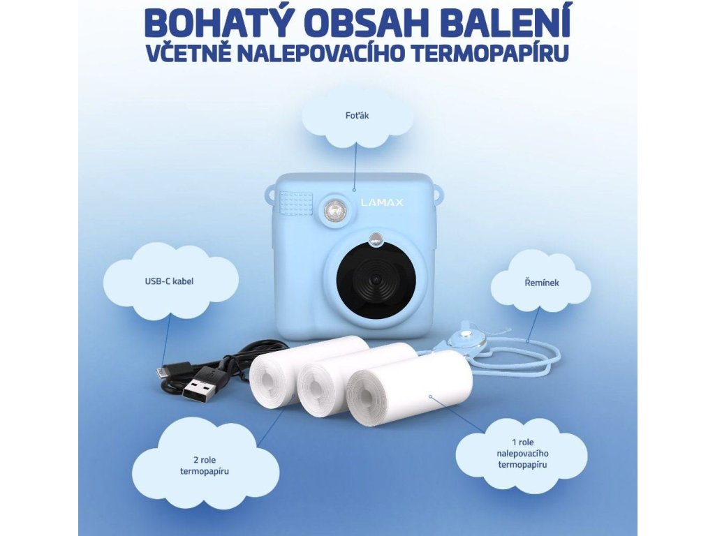 Vybal foťák a hned jdi do akce, balení obsahuje 2 role termopapíru, 1 roli nalepovacího termopapíru a šňůrku pro zavěšení na krk.