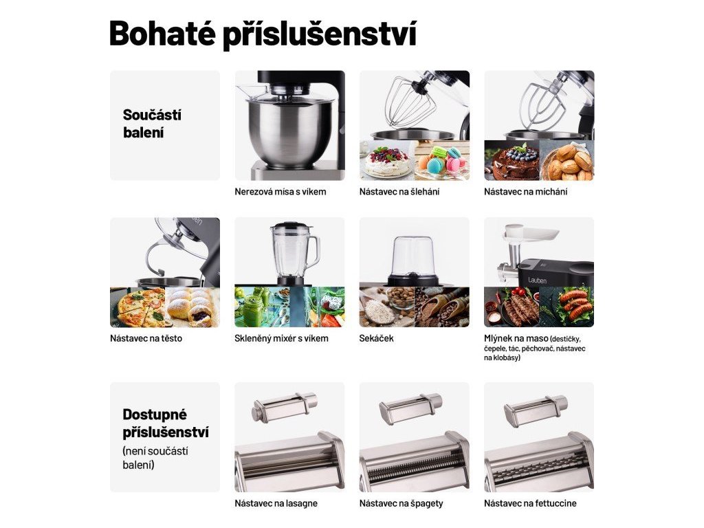 Příslušenství Míchací metla, hnětací hák, průhledný kryt mísy s otvorem, balónová metla, mixér, smoothie nádoba, mlýnek na maso, nástavec na výrobu klobás, nástavec na výrobu kebabu, kuchařka