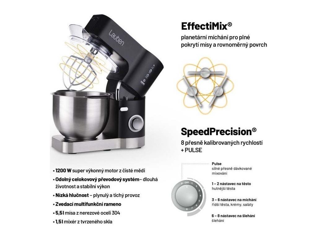 Váš kuchyňský superhrdinaLauben Kitchen Machine 1200WT je kuchyňský robot s bohatým příslušenstvím, díky kterému se za vás hravě postará o spoustu kuchyňských prací a zároveň vám ušetří místo v kuchyni. Ostudu vám v kuchyni neudělá ani vzhledem, což dokládá prestižní designové ocenění IF Design Award 2019. Míchání, šlehání, hnětení těsta i mletí masa, o to vše se spolehlivě postará spolehlivý měděný motor o výkonu 1200W a vysokozátěžové celokovové převody. Robot disponuje technologií EffectiMix® , která zajišťuje planetární mixovací pohyb a rovnoměrný výsledek. Díky systému SpeedPrecision® máte na výběr z 8 přesně kalibrovaných rychlostí a možnosti PULSE pro přesné výsledky. Hlavní mixovací nádoba je vyrobena z nerezové oceli a má kapacitu 5l. Robot jsme doplnili o mixovací sklenici z tvrzeného skla s víkem pro přidávání ingrediencí. Můžete ho tak využít k přípravě studených či vlažných polévek nebo čerstvých smoothies. Bezpečnost je vždy na prvním místě, proto je Lauben Kitchen Machine opatřen pojistkou, která ho spustí jen, je-li správně uzavřen, protiskluzovými nožkami a pojistkou proti přehřátí. Správné usazení mísy bude hračka díky barevnému indikátoru. Robot vás potěší i snadným ovládáním pomocí jediného tlačítka, nízkou hlučností a dvěma barevnými provedeními. Protože moc dobře víme, že není jednoduché každý den vymýšlet, čím nakrmíte rodinu či sebe, přidali jsme do balení kuchařku s recepty pro inspiraci.