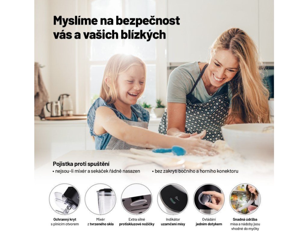 Hlavní nerezovou mísu, skleněný mixér a sekáček lze mýt v myčce nádobí.