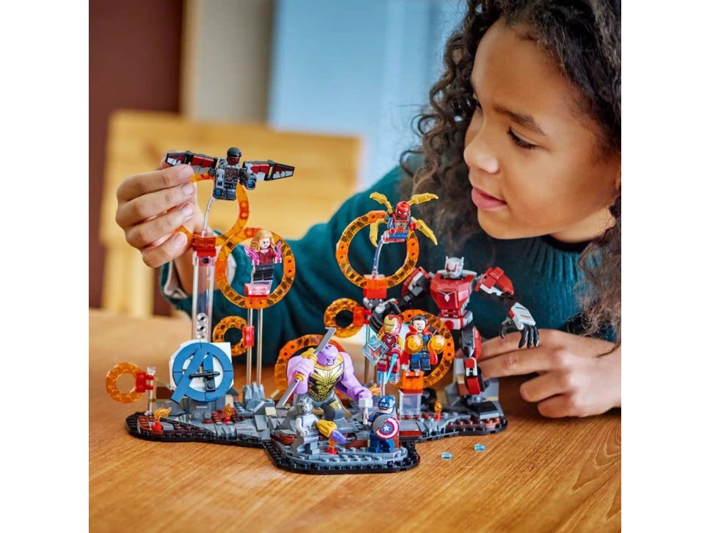 Stavebnice zobrazuje ikonickou bitvu z filmu Avengers: Endgame z dílny studia Marvel. Obsahuje interdimenzionální portály, které jsou vytvořené pomocí dvouprstenu, a 9 minifigurek, jako je Kapitán Amerika se štítem, Iron Man MK85 s mečem a štítem, Chitauri s vystřelovačem na ruce, Ant-Man, Scarlet Witch s dílky ve tvaru plamene, Doctor Strange, Iron Spider se 4 pohyblivýma „nohama“ na zádech, Black Panther a Falcon se 2 vystřelovači. Děti se mohou těšit na velkou figurku Thanose, plně pohyblivý robotický oblek Ant-Mana a 2 funkce vybuchujících skal, díky nimž si užijí parádní superhrdinskou akci.