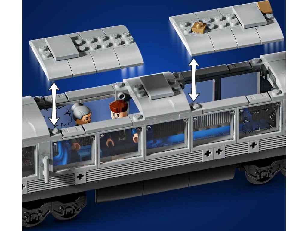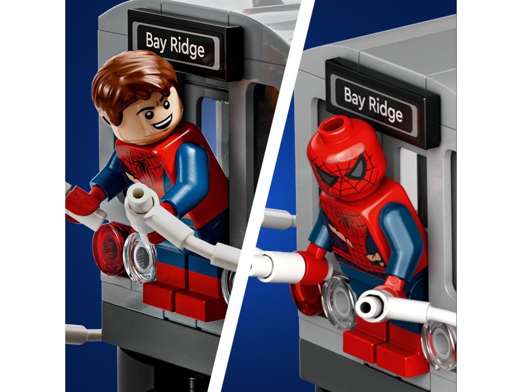 Sběratelské předměty LEGO® | Marvel – Minifigurka Spider-Mana má hlavu s maskou i bez ní a střecha vlaku umožňuje přístup do interiéru, kde se může usadit cestující