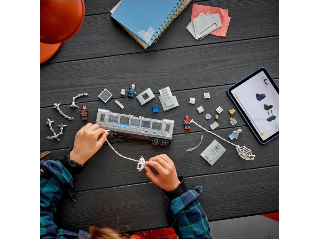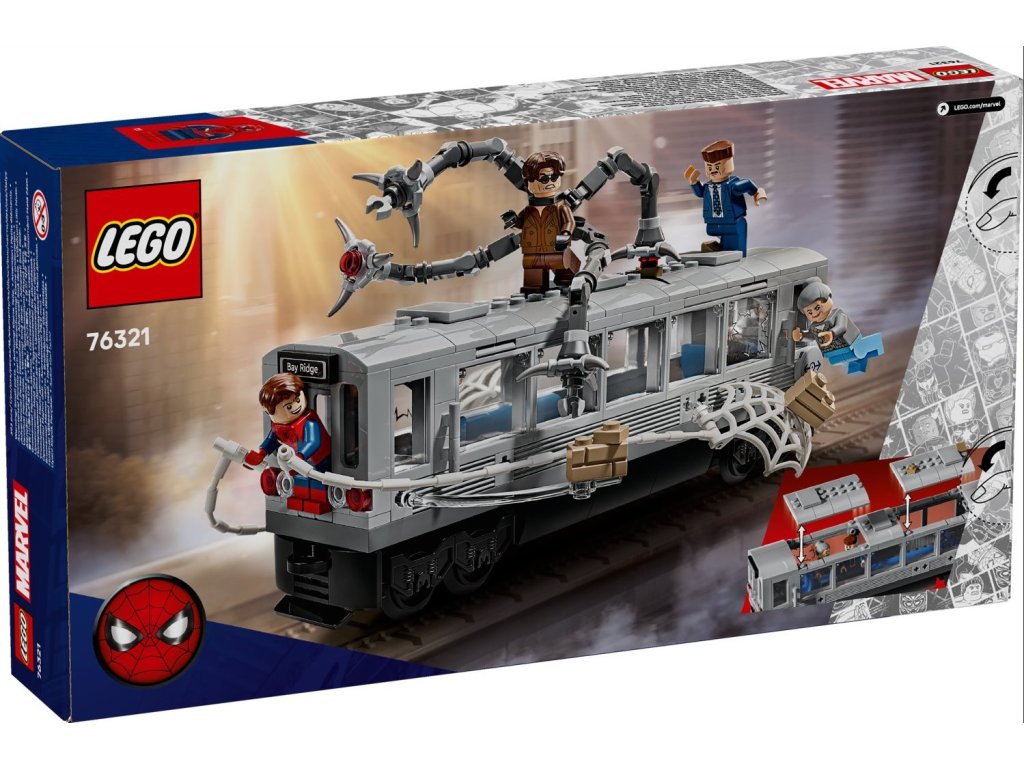 Stavebnice Spider-Man vs. Doc Ock: Scéna v metru (76321) nadchne malé milovníky akčních dobrodružství a bojových stavebnic LEGO® | Marvel. Tato superhrdinská stavebnice přináší nekonečné možnosti nápaditého hraní a vystavování a představuje skvělý dárek pro kluky a holky od 9 let.Tato superhrdinská stavebnice s modelem metra je inspirovaná kultovní scénou z filmu Spider-Man 2 od studia Marvel. Součástí jsou 4 minifigurky: J. Jonah Jameson, teta May, Spider-Man a Doc Ock. Minifigurka Spider-Mana má vyměnitelné hlavy – s maskou i bez ní – a velkou pavučinu, kterou lze připevnit k vlaku. Minifigurka Doc Ocka má 4 pohyblivá chapadla, 2 s dílky „laserového paprsku“ a 2 s klipy, které lze připevnit k vlaku. Po odejmutí střechy můžete nahlédnout do interiéru vlaku, kde je dostatek místa pro usazení minifigurek. Pro ještě větší digitální zábavu můžou stavitelé přibližovat a otáčet modely ve 3D a sledovat svůj postup pomocí intuitivní aplikace LEGO Builder. Stavebnice obsahuje 393 dílků.