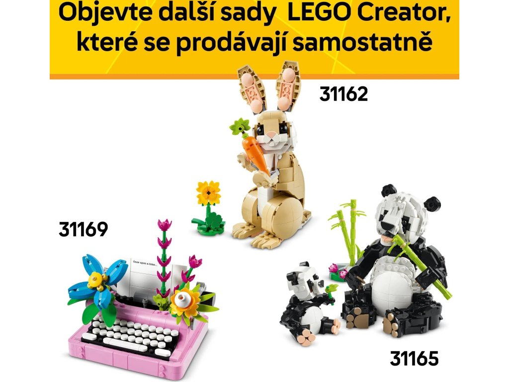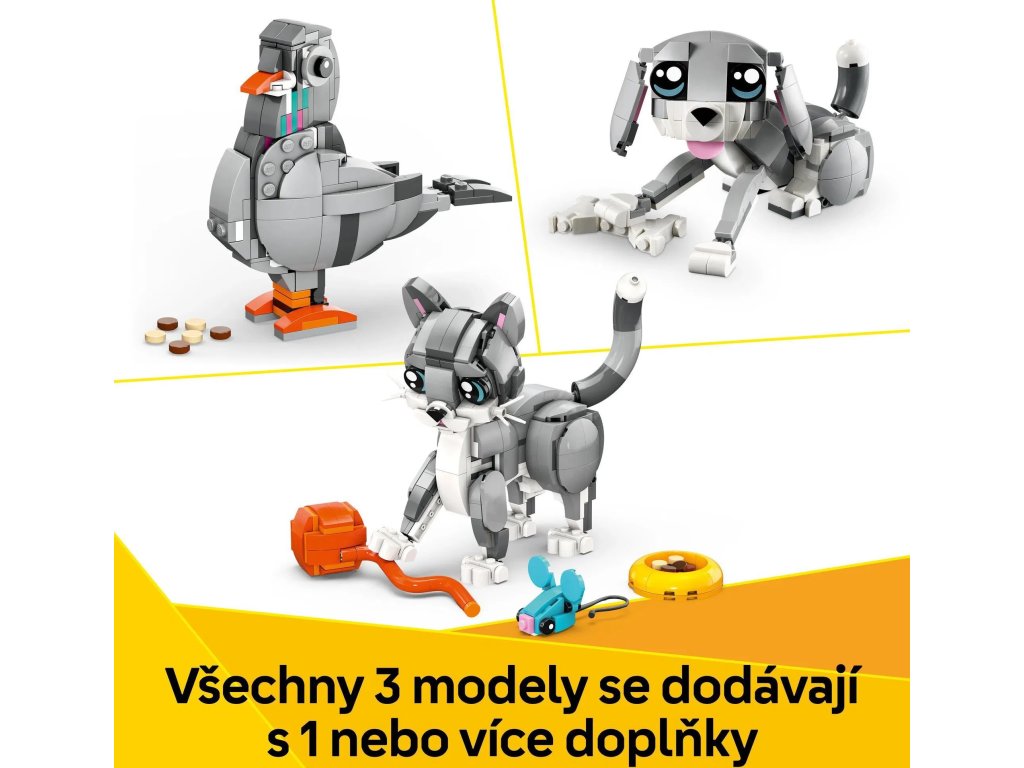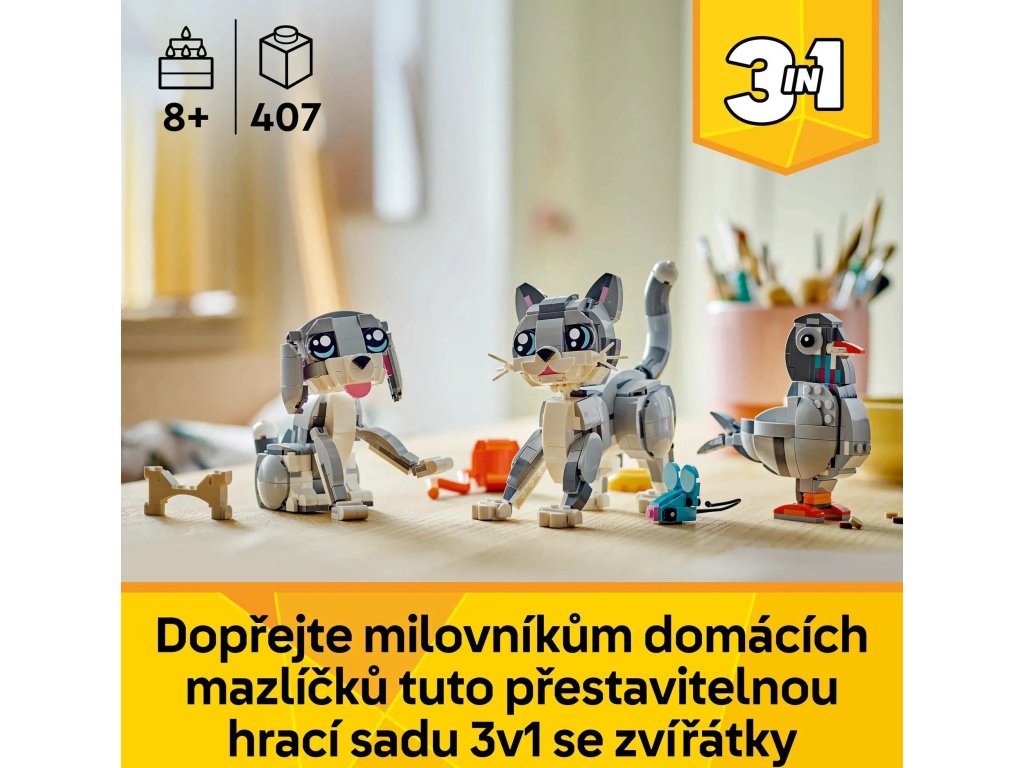 Potěšte milovníky domácích mazlíčků od 8 let rozkošnou stavebnicí LEGO® Creator 3 v 1 (31163) Hravá kočka. S touto stavebnicí domácích mazlíčků si postavíte roztomilou kočku s pohyblivou hlavou, ušima, ocasem a nohama a doplňky, včetně misky na krmení, myši a klubíčka, a děti se s ní můžou hrát na zábavné příběhy. Holky a kluci si s touto stavebnicí LEGO postaví hned 3 různé modely zvířátek ze stejných kostek: pohyblivou kočku, která může sedět, stát a skákat, pohyblivého roztomilého pejska s kostí a model holuba s drobky. Díky těmto 3 modelům se jedná o skvělý dárek LEGO, který si děti můžou vystavit a užít si s ním nápadité hraní. Stavebnice LEGO Creator 3 v 1 inspirují děti ke kreativnímu stavění – v každé krabici najdou dílky k sestavení a přestavování 3 různých modelů. Se stavebnicemi 3 v 1 si postaví modely inspirované jejich zájmy, včetně superrychlých vozidel, úžasných zvířat a propracovaných domů. Upozorňujeme, že modely nelze sestavit současně.Doplňkové parametry