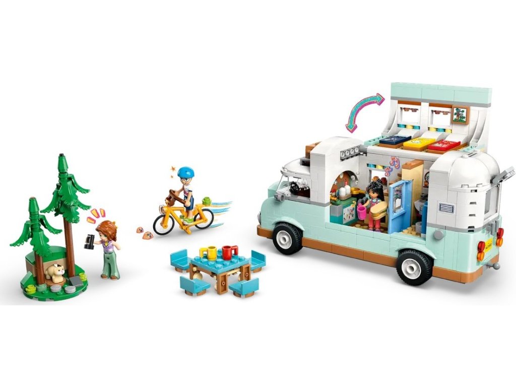 Holky a kluci od 7 let si se stavebnicí LEGO® Friends (42663) Dobrodružství s karavanem přátelství užijí spoustu zábavy. Sada obsahuje sestavitelné vozidlo LEGO, 3 minipanenky a figurku fretky. V této stavebnici karavanu pro děti najdete vše, co malí průzkumníci potřebují k vyprávění vlastních příběhů o kempování. Kamarádi sedí v kabině řidiče a hledají dokonalé místo na zaparkování v lese. Otevřete karavan a odhalte vybavenou kuchyň a toaletu. Zaručeně uslyšíte chichot, když děti uvidí, jak po „spláchnutí“ záchodu mizí odpad! Schody vedou do prostoru na spaní, kde je postel pro každou ze 3 minipanenek. Mezi další detaily patří kolo, na kterém mohou postavičky jezdit, piknikový stůl s židlemi, venkovní sprcha a kempingové doplňky včetně kompasu, klíče a dalekohledu. Objevte další zábavné hračky ze světa LEGO Friends (prodávají se samostatně), ve kterých vás čeká spousta dalších příběhů o přátelství.Doplňkové parametry