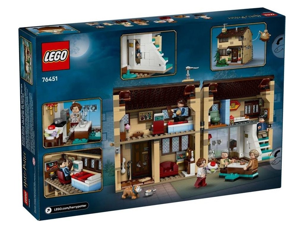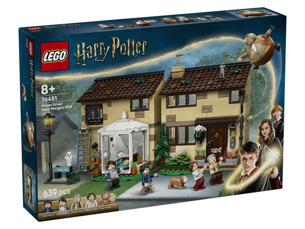 Znovu prožijte návštěvu tety Marge v Zobí ulici 4 z filmu Harry Potter a vězeň z Azkabanu s touto sběratelskou stavebnicí LEGO® Harry Potter™ (76451). Sestavitelný dům se zimní zahradou je propracovanou replikou rodinného domu Dursleyových a lze ho otevřít pro snadný přístup do interiéru. V kuchyni s jídelnou najdete odnímatelný stůl, v zadní části domu tajné dveře do Harryho starého pokoje pod schody, na okně Harryho pokoje v horním patře najdete odnímatelné mříže, se kterými si můžete připomenout scénu Harryho útěku, a nechybí spousta dalších autentických doplňků, které inspirují ke kreativnímu hraní.Tato fantastická dobrodružná stavebnice představuje kouzelný vánoční nebo narozeninový dárek pro kluky, holky a fanoušky od 8 let a obsahuje 5 minifigurek LEGO Harry Potter a figurku psa Raťafáka. Nechybí ani figurka nafouknuté tety Marge z vtipné scény, ve které na ni Harry sešle kouzlo, po kterém se nafoukne jako balón. Součástí je také menší model s nápisem „Privet Drive“ („Zobí ulice“) a pouličním osvětlením.