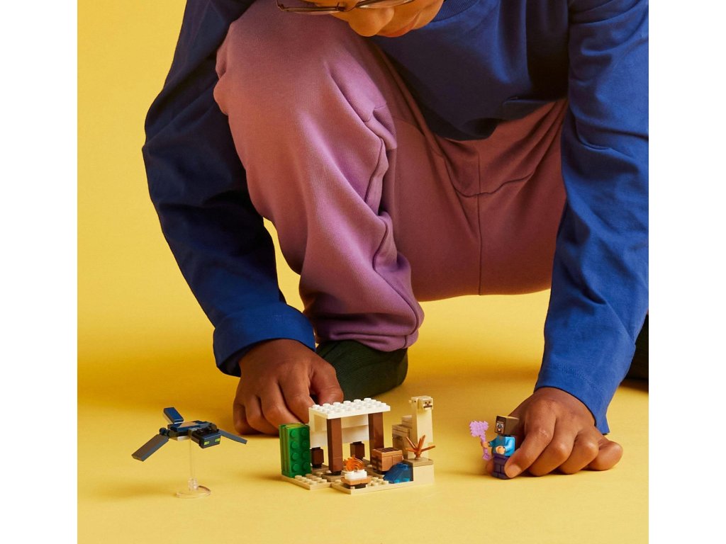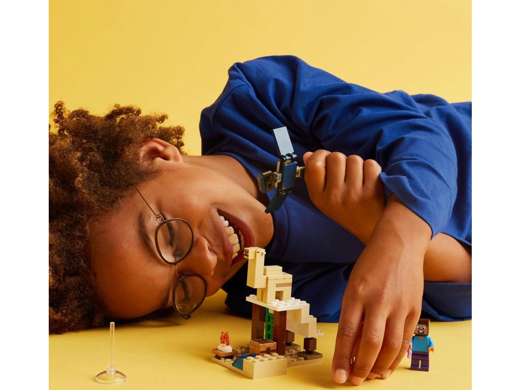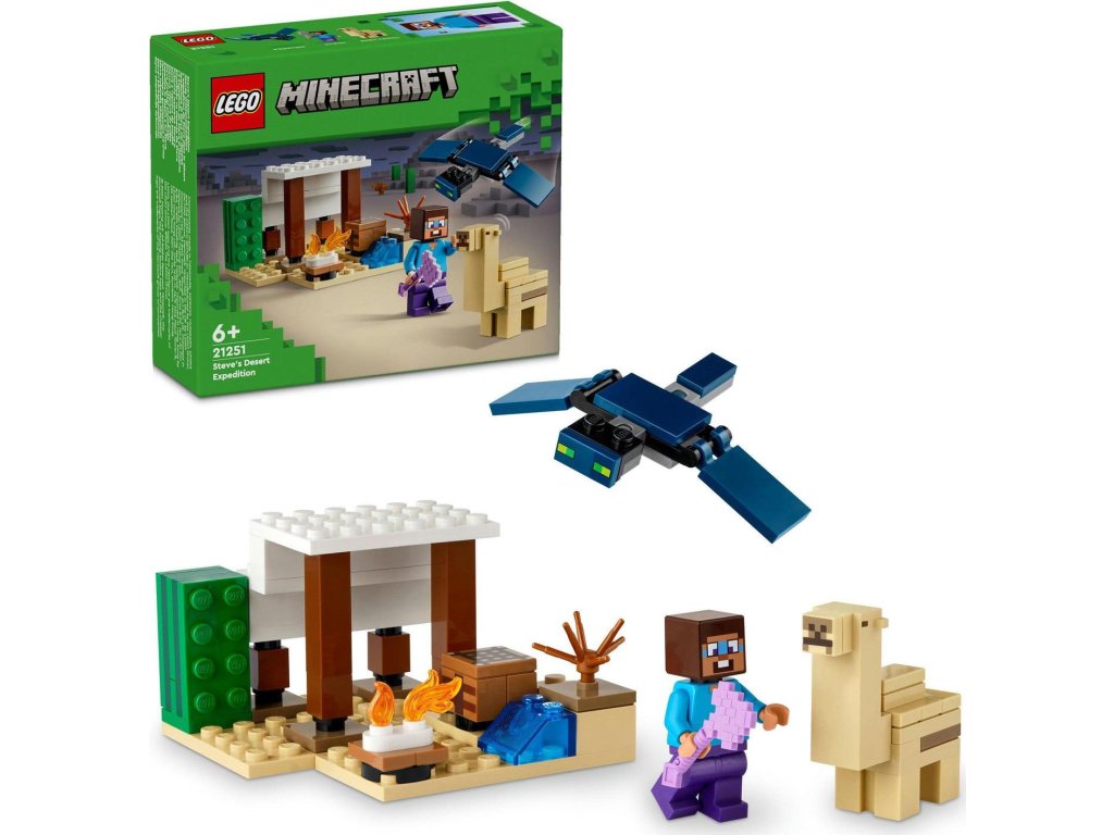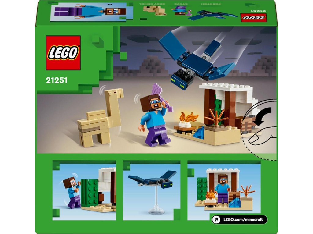 Tato stavebnice LEGO® Minecraft® pro malé stavitele od 6 let je zcela první sada s biomem pouště ze světa Minecraftu. Steve a výprava do pouště (21251) děti inspiruje k postavení domku v nehostinném prostředí, který poté musí ubránit před létajícím Přízrakem.V této přestavitelné herní stavebnici pro děti od 6 let najdete 3 figurky LEGO Minecraft, včetně Stevea, a domek v poušti. Součástí sady jsou také proslulé prvky ze hry Minecraft, jako je pracovní stůl, táborák a řada dílků pro sestavení pouště. Jedná se o skvělý dárek pro fanoušky Minecraftu, který přímo vyzývá k tvořivým dobrodružstvím a akčním bitvám, když základnu napadne létající Přízrak s pohyblivými křídly. Zcela poprvé se ve stavebnici LEGO Minecraft objevuje mládě velblouda a nechybí ani nová verze Steveovy tváře. Sadu lze kombinovat s dalšími stavebnicemi z řady LEGO Minecraft (prodávají se samostatně) a představuje skvělý dárek pro děti i milovníky videoher.