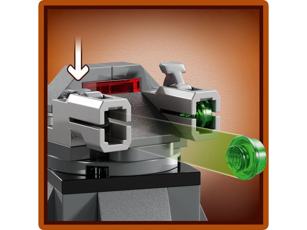 Stavebnice Star Wars™ pro děti – Mandaloriánská základna v této stavebnici má těžce obrněné dveře se spouští, která se aktivuje při zabouchnutí, ovládací panely, a navíc otočnou vystřelovací věž