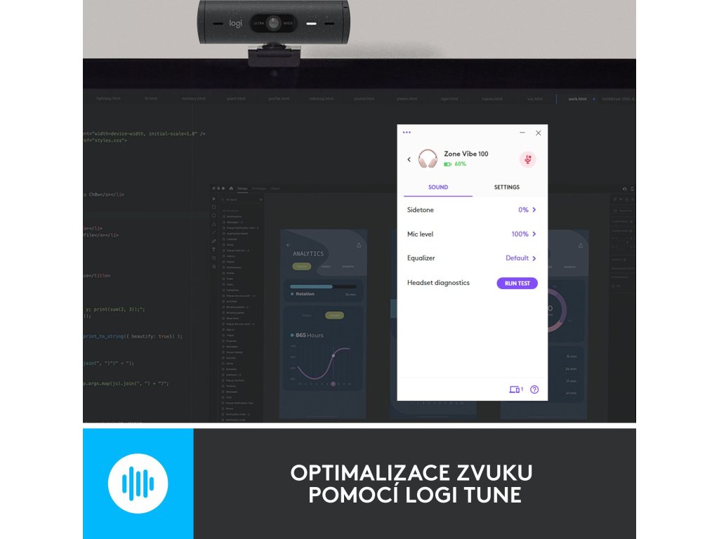 Ovládejte svou hudbu a průběh schůzek pomocí Logi Tune (3). Regulujte odposlech, úroveň mikrofonu a ekvalizér. Připojte se ke schůzkám pouhým kliknutím.