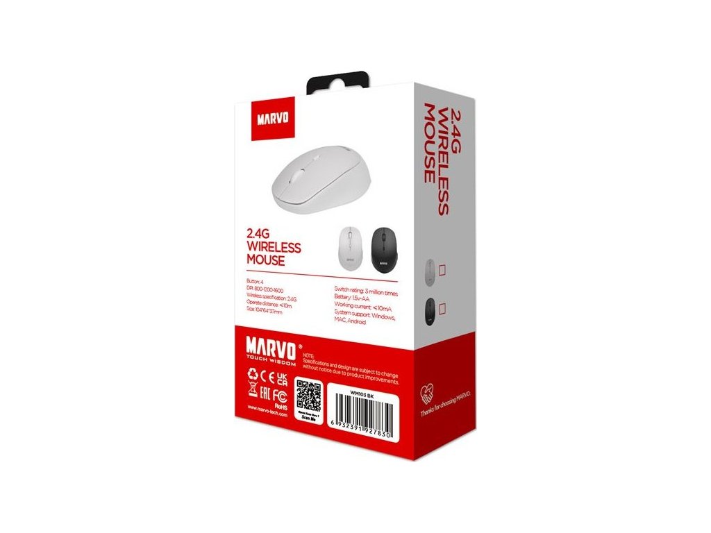 I společnost Marvo se rozhodla vyhovět všem lidem, kteří nejsou hráčí a nebo gaming není jejich denní chleba. Rozhodli se potěšit všechny ty, kteří pracují v kanceláři, doma nebo na cestách. Tato optická myš Vás na první pohled zaujme svým jemným designem, který zapadne do každé kanceláře. Pro větší efektivitu práce lze DPI nastavit od 800 až do 1600.Dosah až 10 metrů