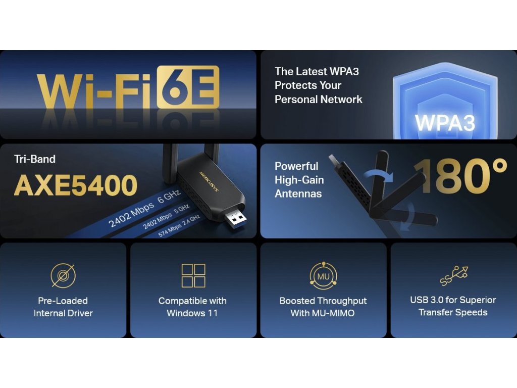 Výkonný USB adaptér s podporou Wi-Fi 6E poskytuje třípásmové připojení s rychlostí až 2402 Mb/s v pásmech 6 GHz a 5 GHz a 574 Mb/s v pásmu 2,4 GHz, což zajišťuje plynulé streamování HD obsahu, online hraní i rychlé stahování velkých souborů. Díky předinstalovanému internímu ovladači je instalace snadná a intuitivní – stačí adaptér připojit a ihned využívat vysokorychlostní internet. Využití USB 3.0 rozhraní umožňuje plně využít dostupnou šířku pásma a zajistit stabilní připojení pro náročné aplikace.Širší pokrytí a bezpečné připojení