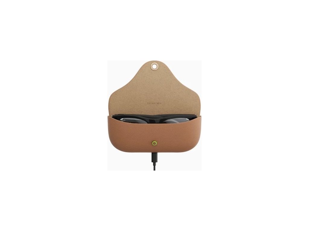 An open brown Meta Charging Case for Ray-Ban Meta AI glasses